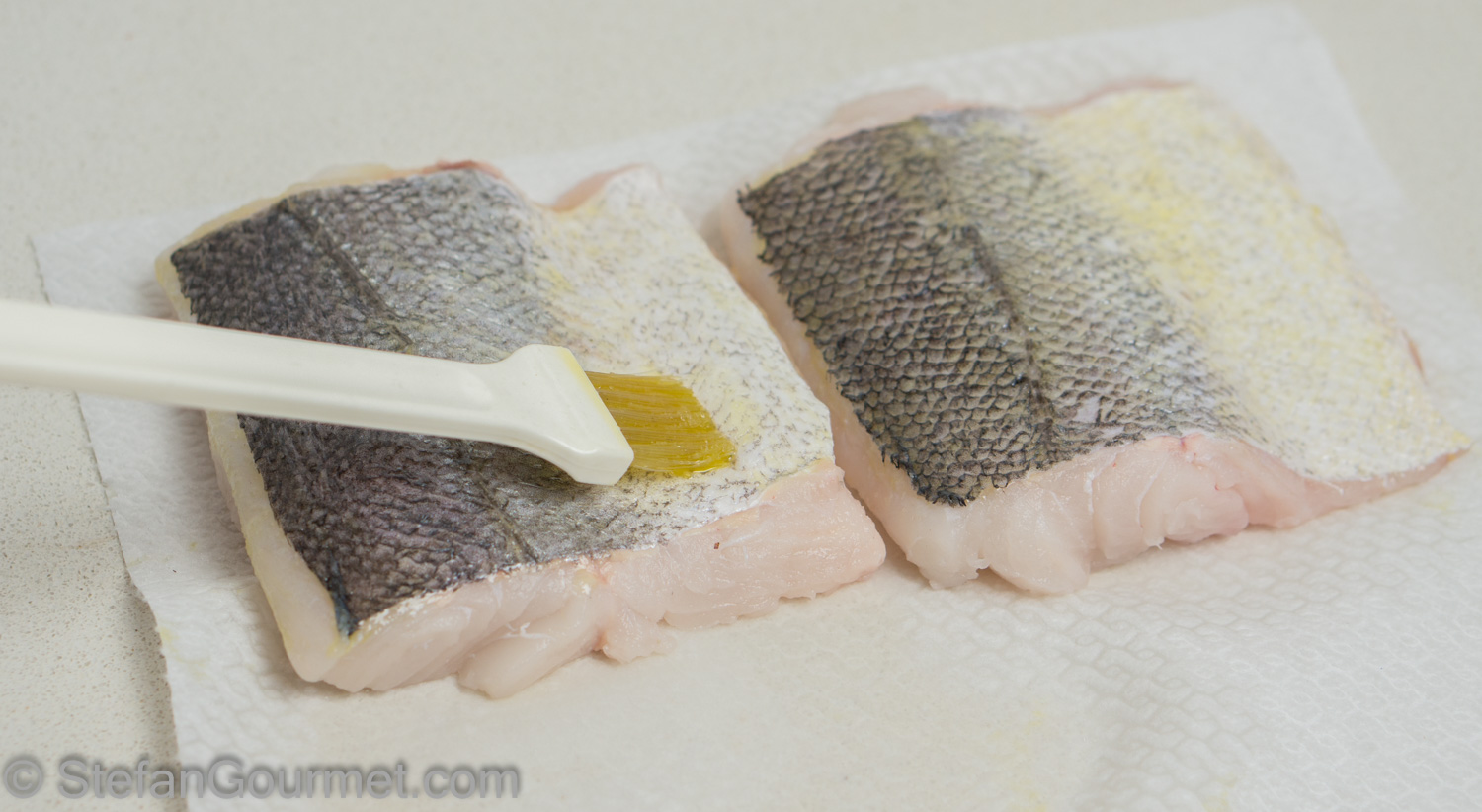 Season the fish with salt on both sides. Rub the skin side lightly with olive oil.