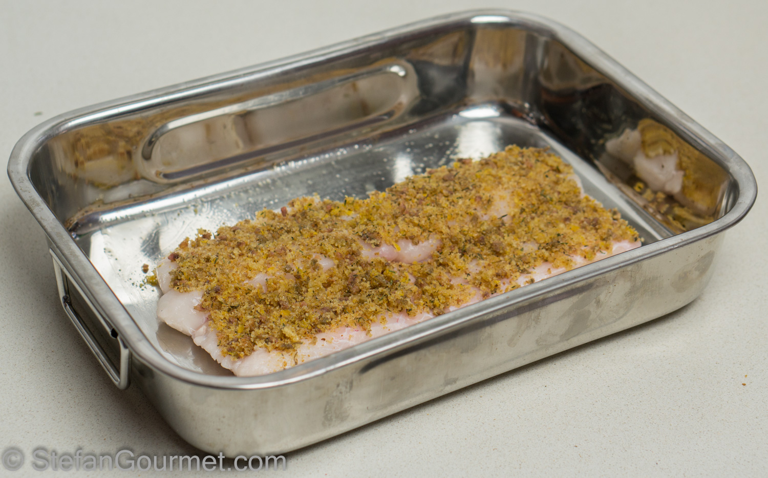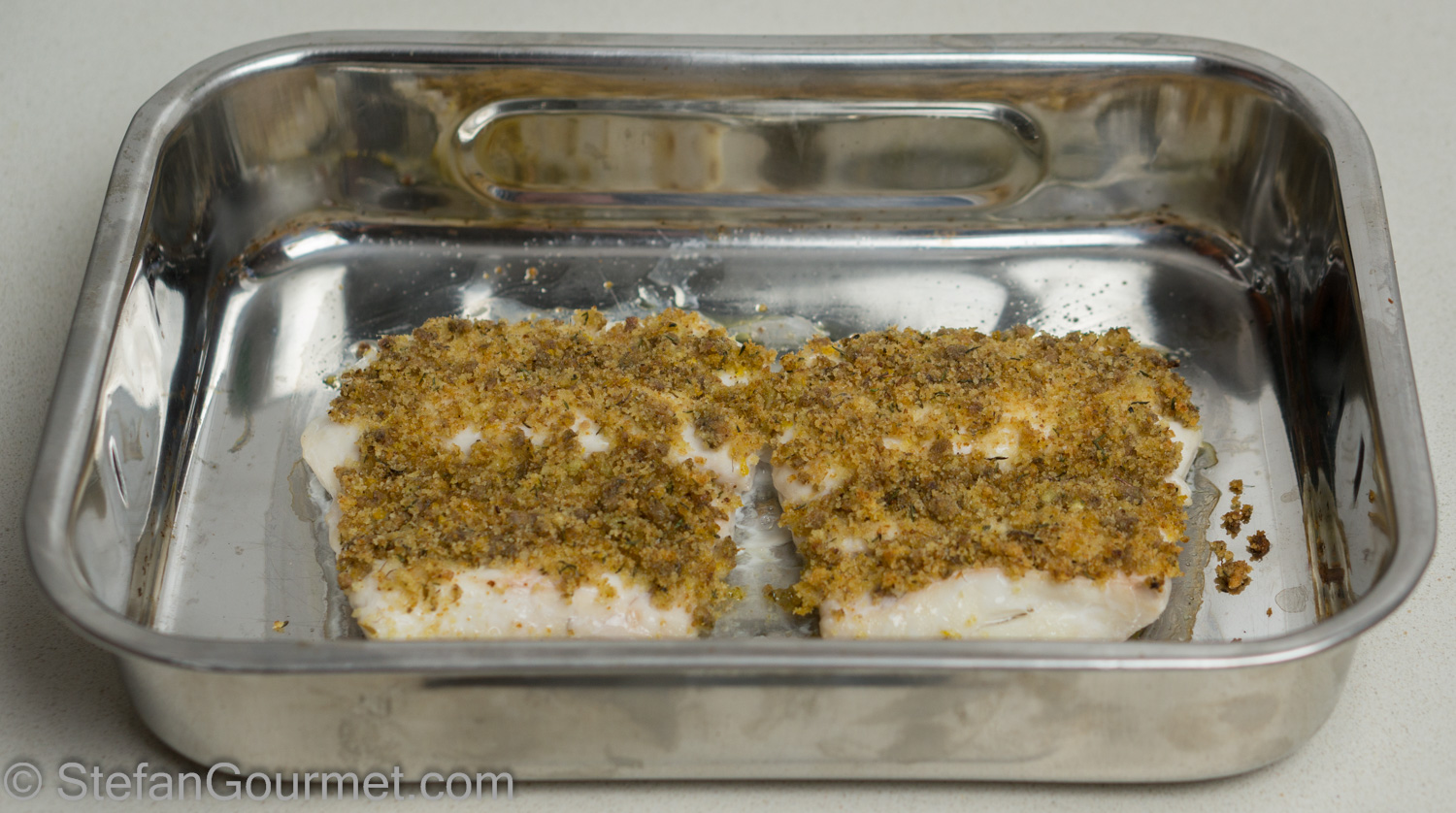 The topping was wonderful and I will definitely make this again. Grazie, Silva! You can make this with any type of white fish. Personally I prefer hake (nasello in Italian) to cod (merluzzo) because it is more juicy and has more flavor. With the skin left on, it is easier to serve the fish fillets without breaking them. The only change that I made to Silva’s recipe is that I doubled the amount of topping and pre-mixed the topping with olive oil so it would brown more evenly. Here’s what I did…