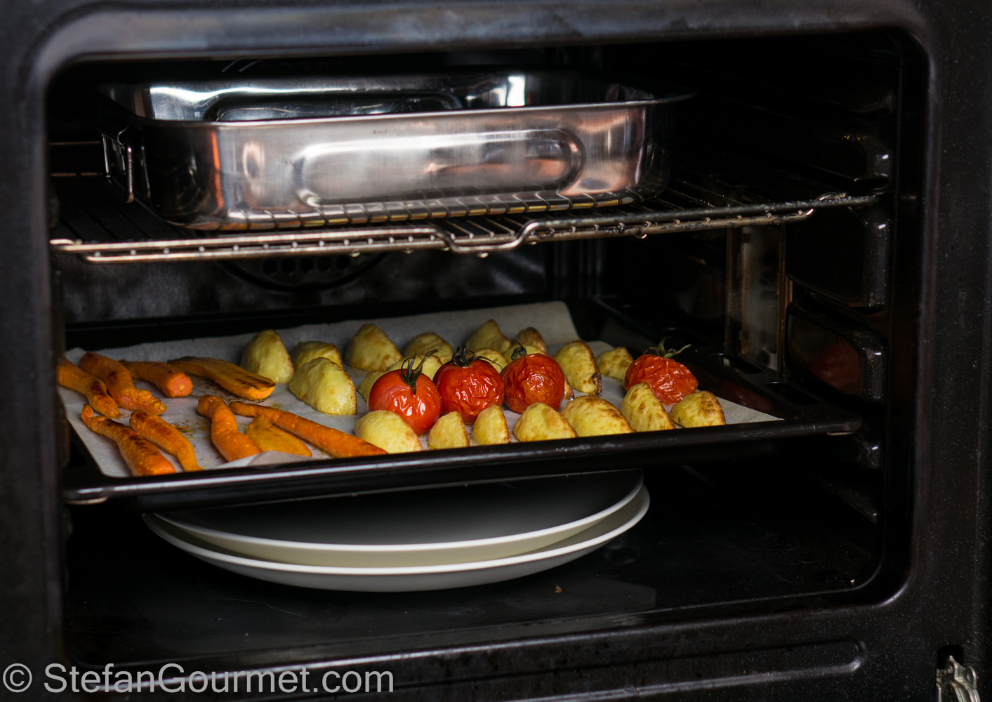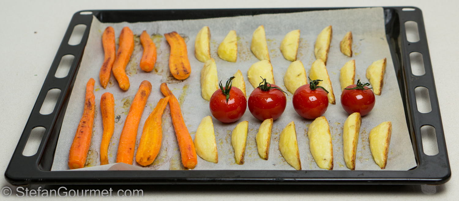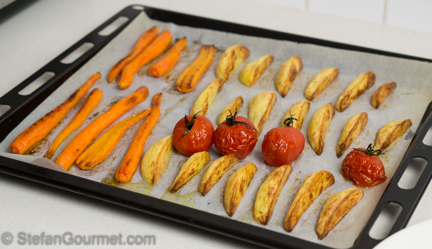 After 20 minutes of roasting, take the carrots and potatoes out of the oven and lower the oven temperature to 180ºC/375ºF (fan forced). Turn the carrots and potatoes to allow them to cook evenly. Brush the cherry tomatoes with olive oil and add them to the baking sheet.