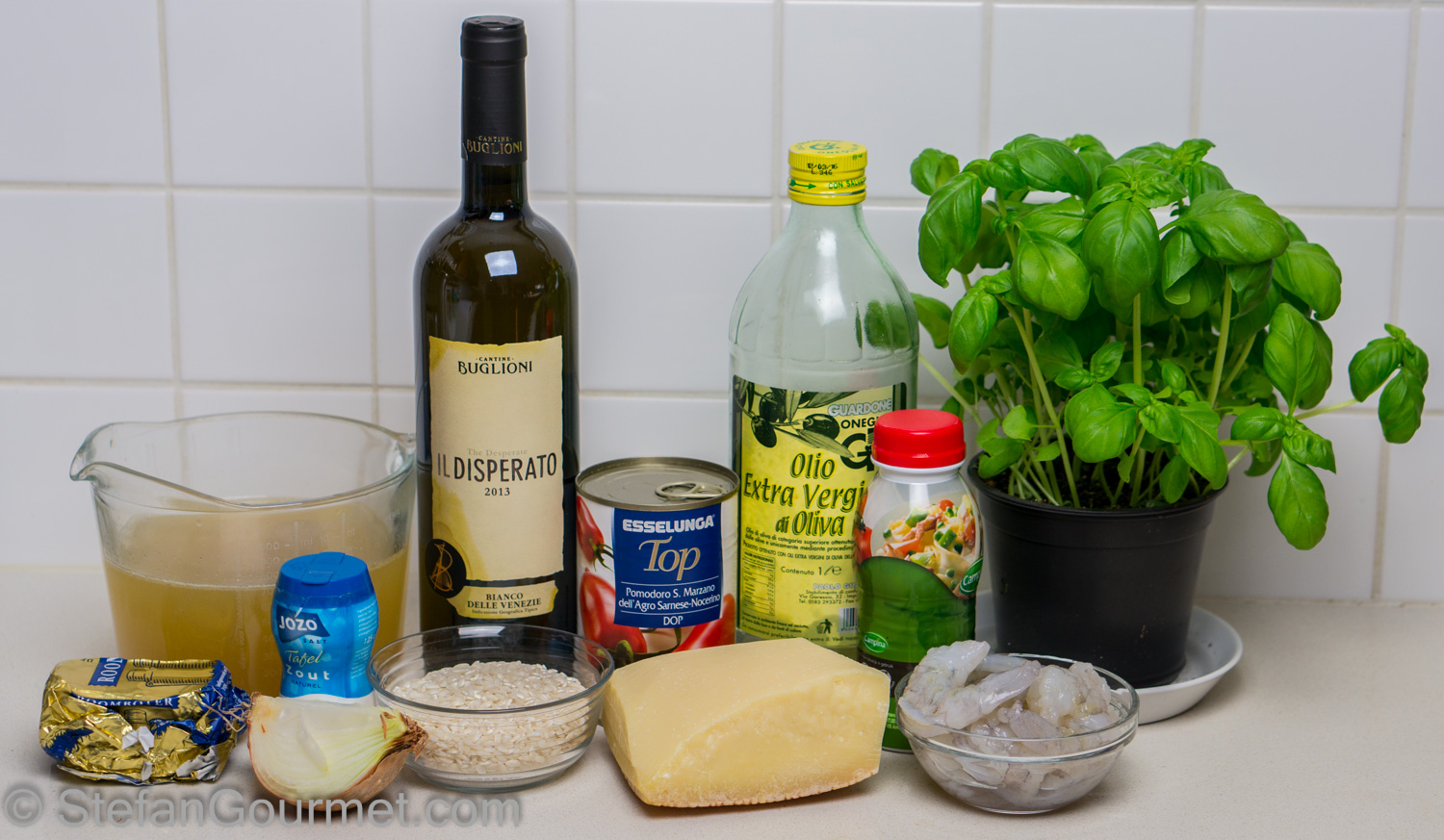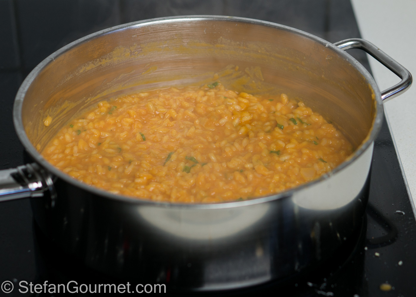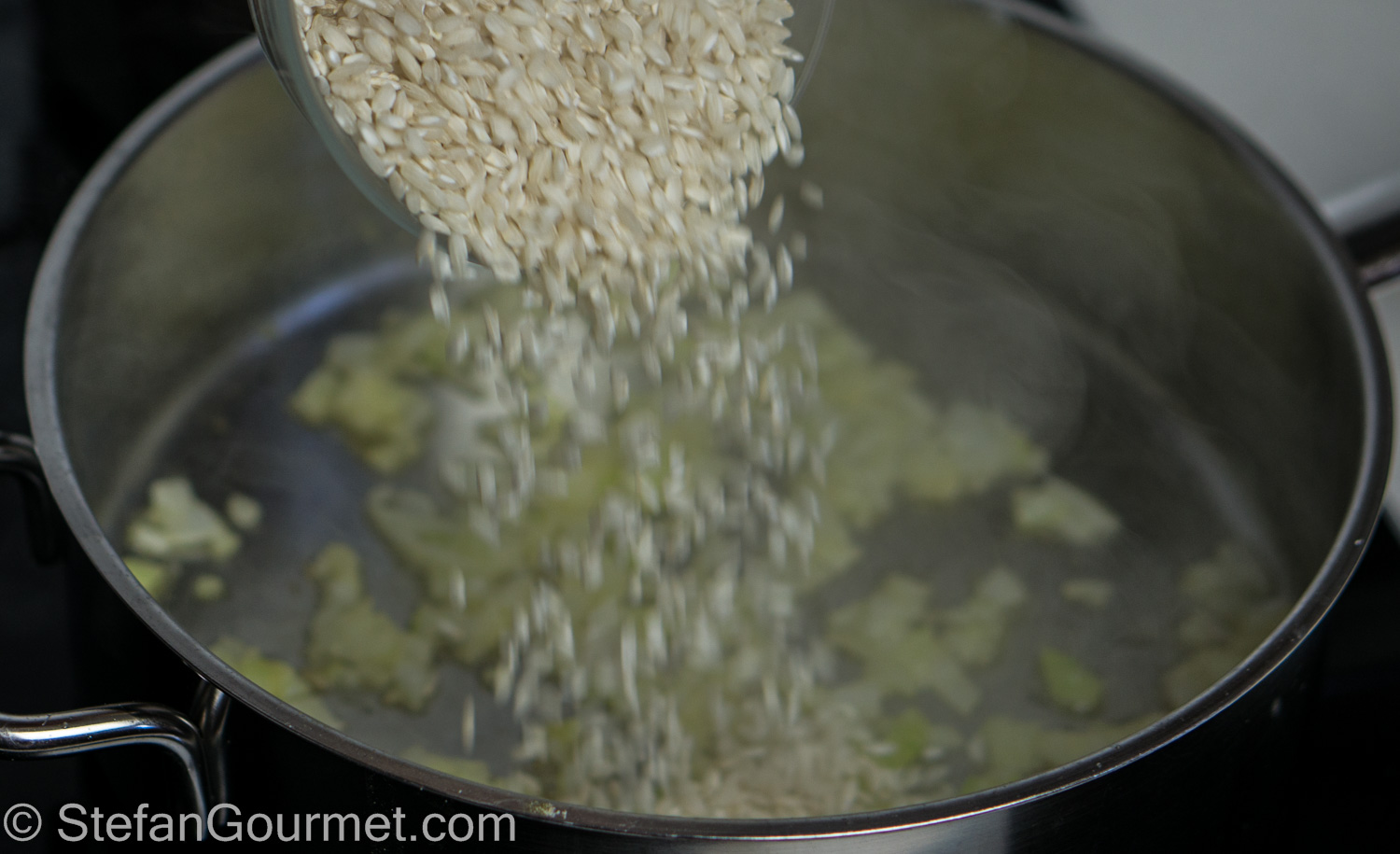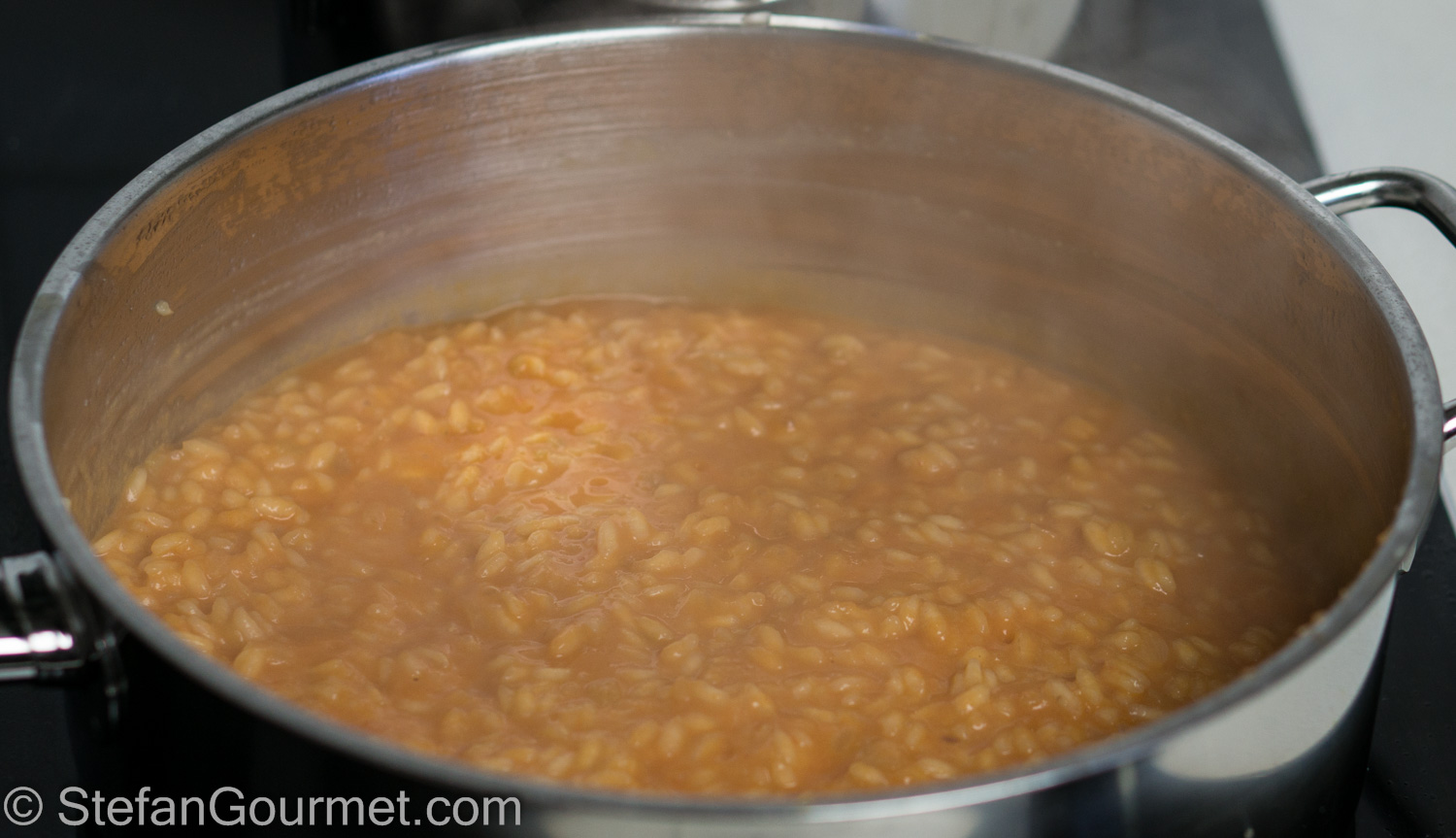 Compared to Biba’s recipe I made a few changes. I increased the amount of shrimp and served sautéed shrimp on top of the risotto. I also added just a touch of cayenne pepper to increase the flavor. It should be so little that you hardly notice it, but it does enhance it. And finally I used fish stock instead of chicken stock. I think it is more appropriate in a seafood risotto.