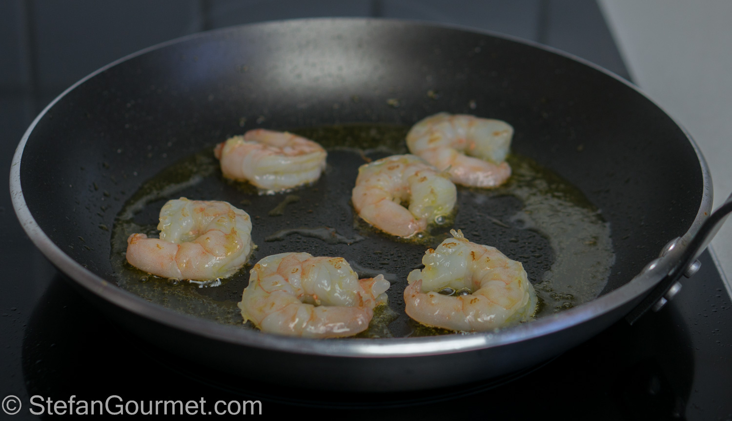 Heat up the fish stock and keep it hot. Heat the olive oil in a frying pan. Add half the shrimp and cook over high heat about 1 minute per side. Turn off the heat.