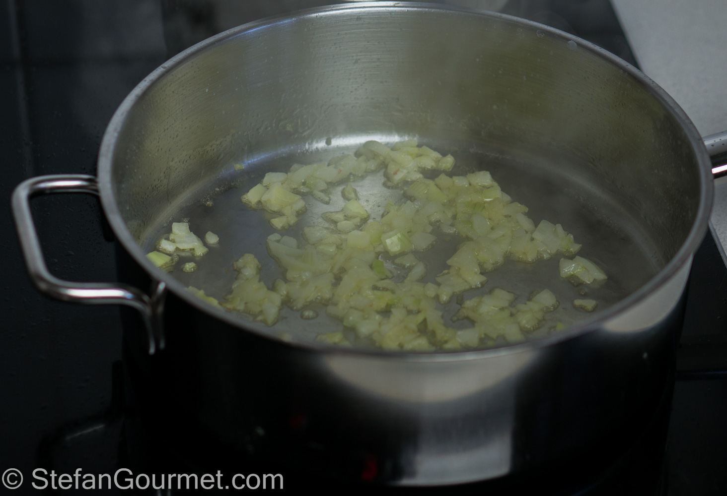 Melt 2 Tbsp of the butter in a wide thick-bottomed pan. Add the onion and sauté over medium heat until the onion is translucent.
