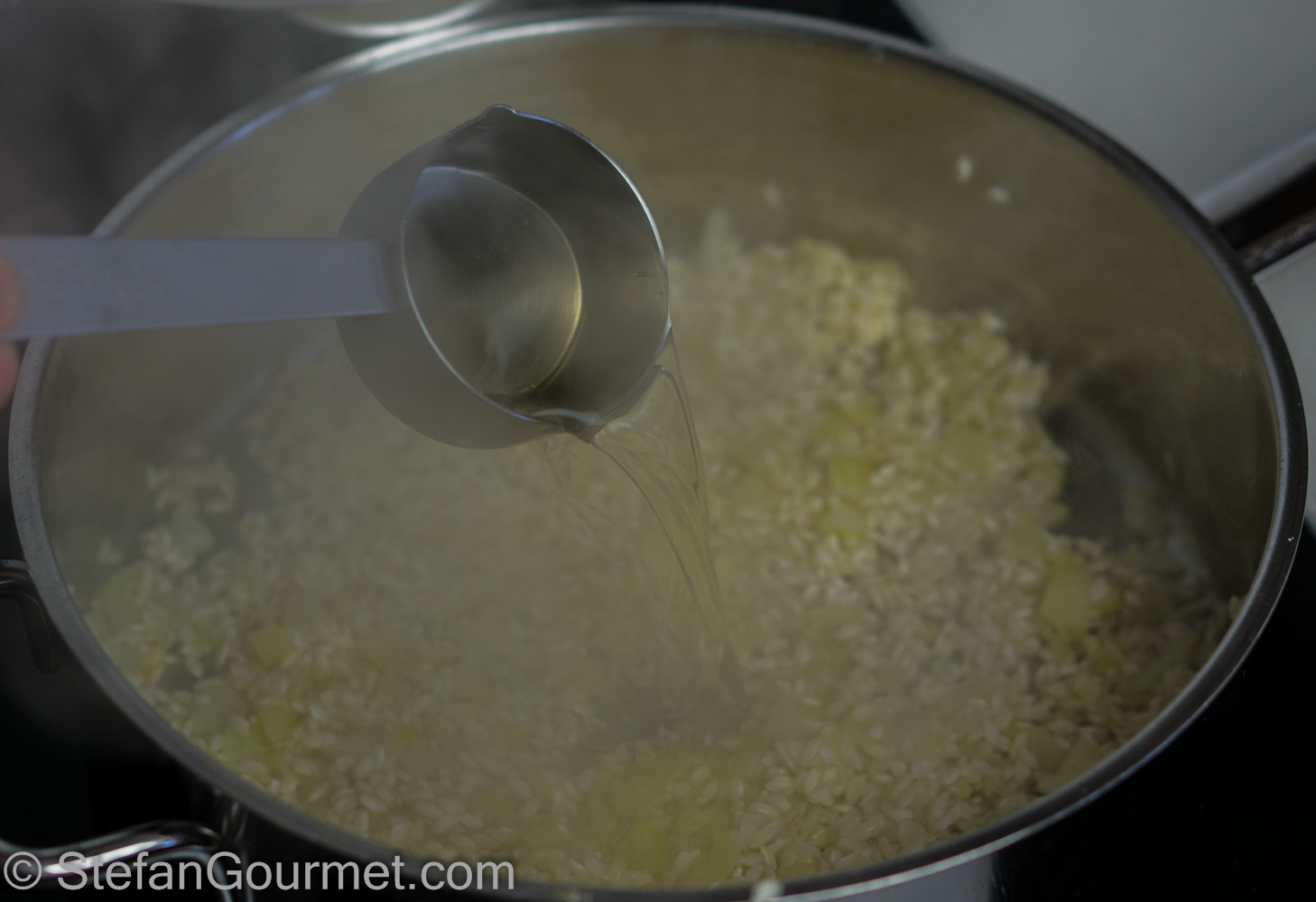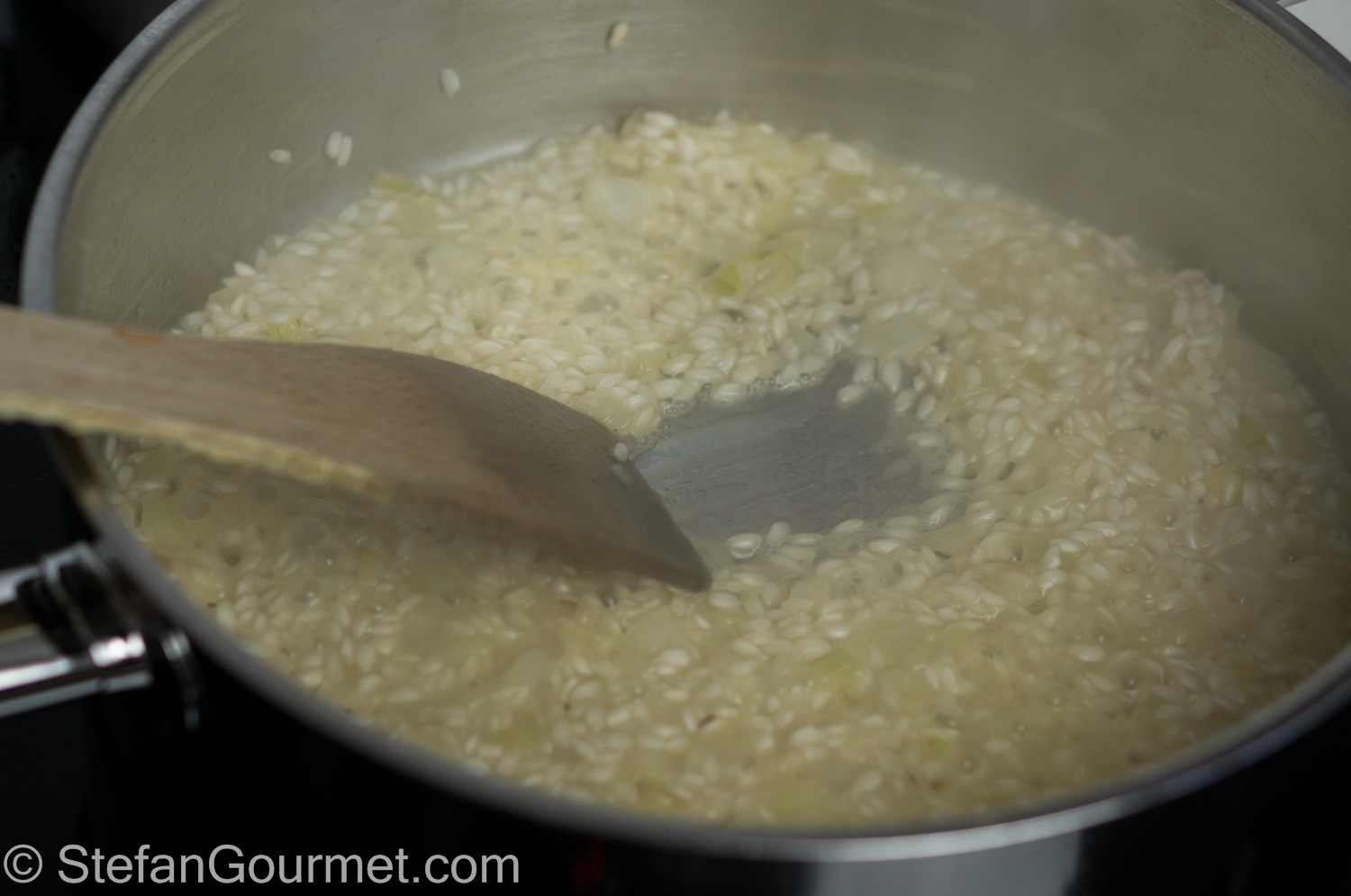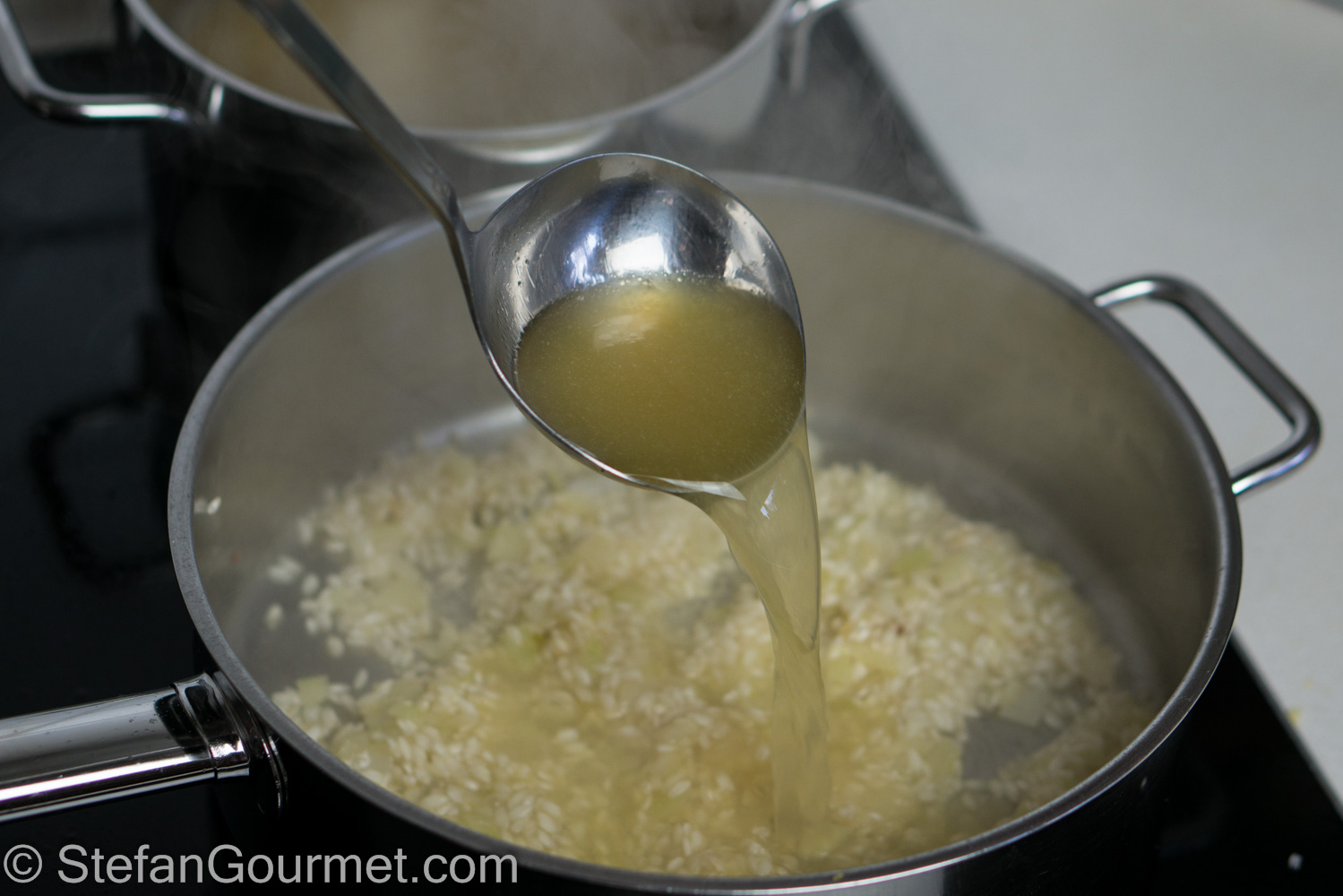 Stir until the stock has been incorporated. Then add another ladle of stock. Keep stirring and adding more stock until the rice is almost cooked, about 15 minutes.