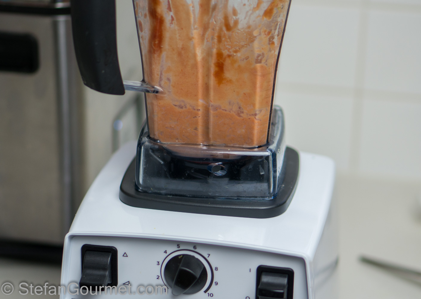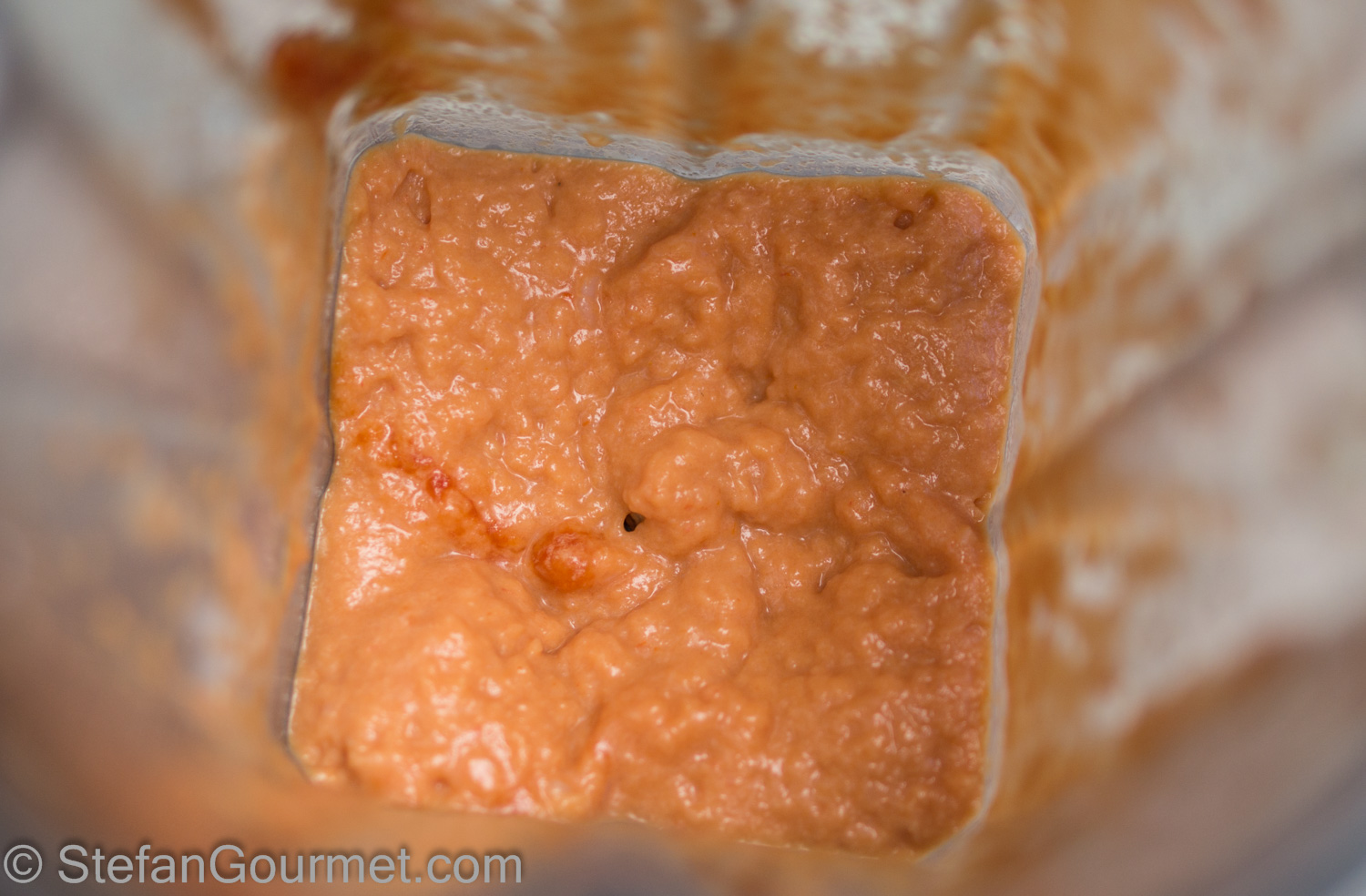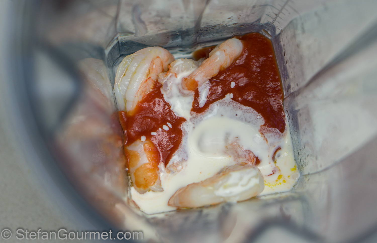 Combine the shrimp with the cream and the tomato puree in a blender.
