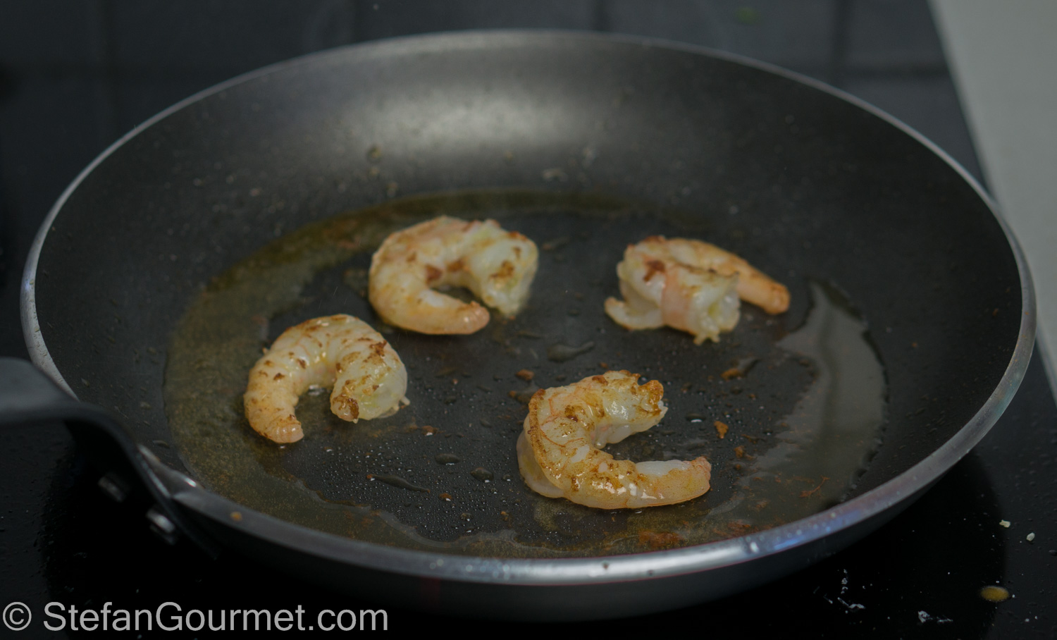 Heat the pan in which you sautéed the shrimp back up and cook the reserved shrimp over high heat for about a minute per side. Season with salt.