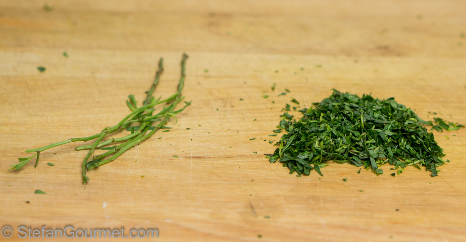 Pick the leaves off the tarragon and mince them, reserve the stems.