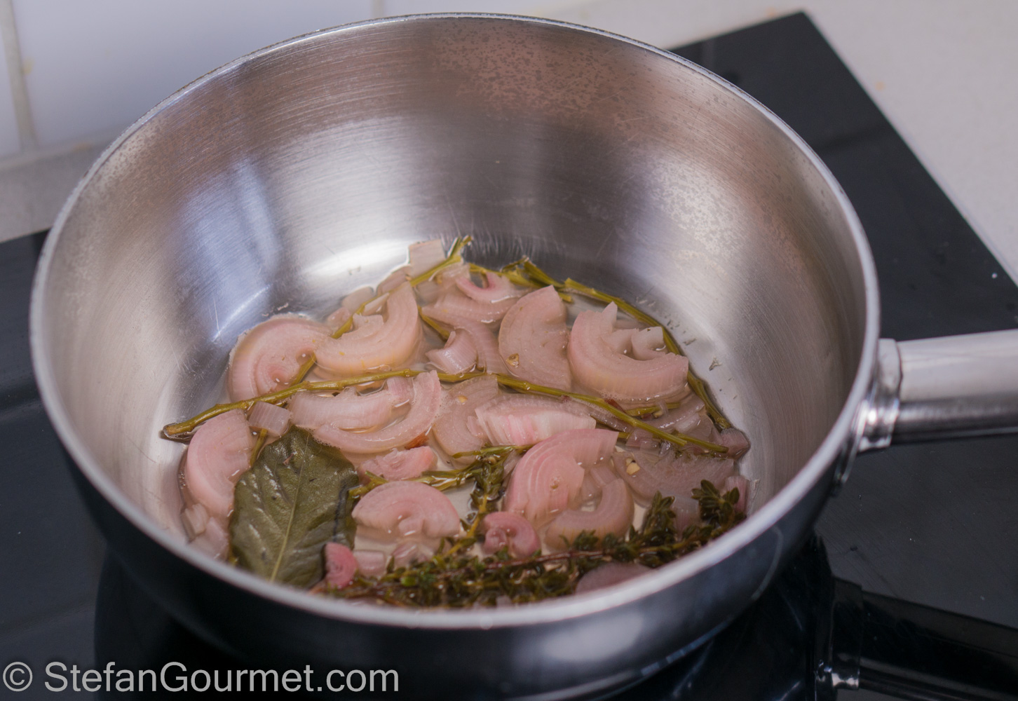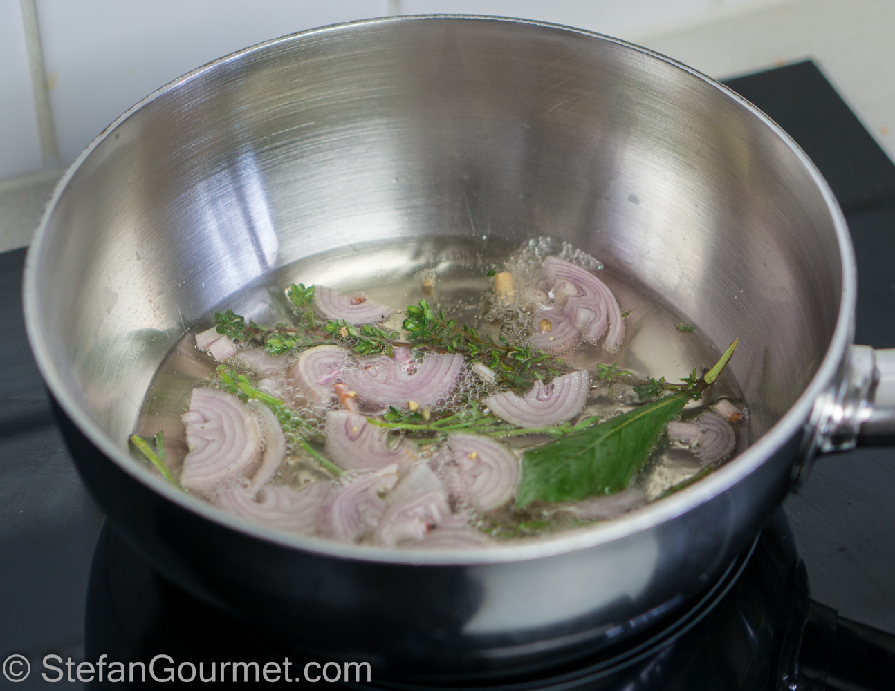 Put the white wine, the white wine vinegar, the reserved tarragon stems, the shallot, the bay leaf, the thyme, and the crushed peppercorns in a saucepan. Bring to a boil, then reduce the heat to a simmer.