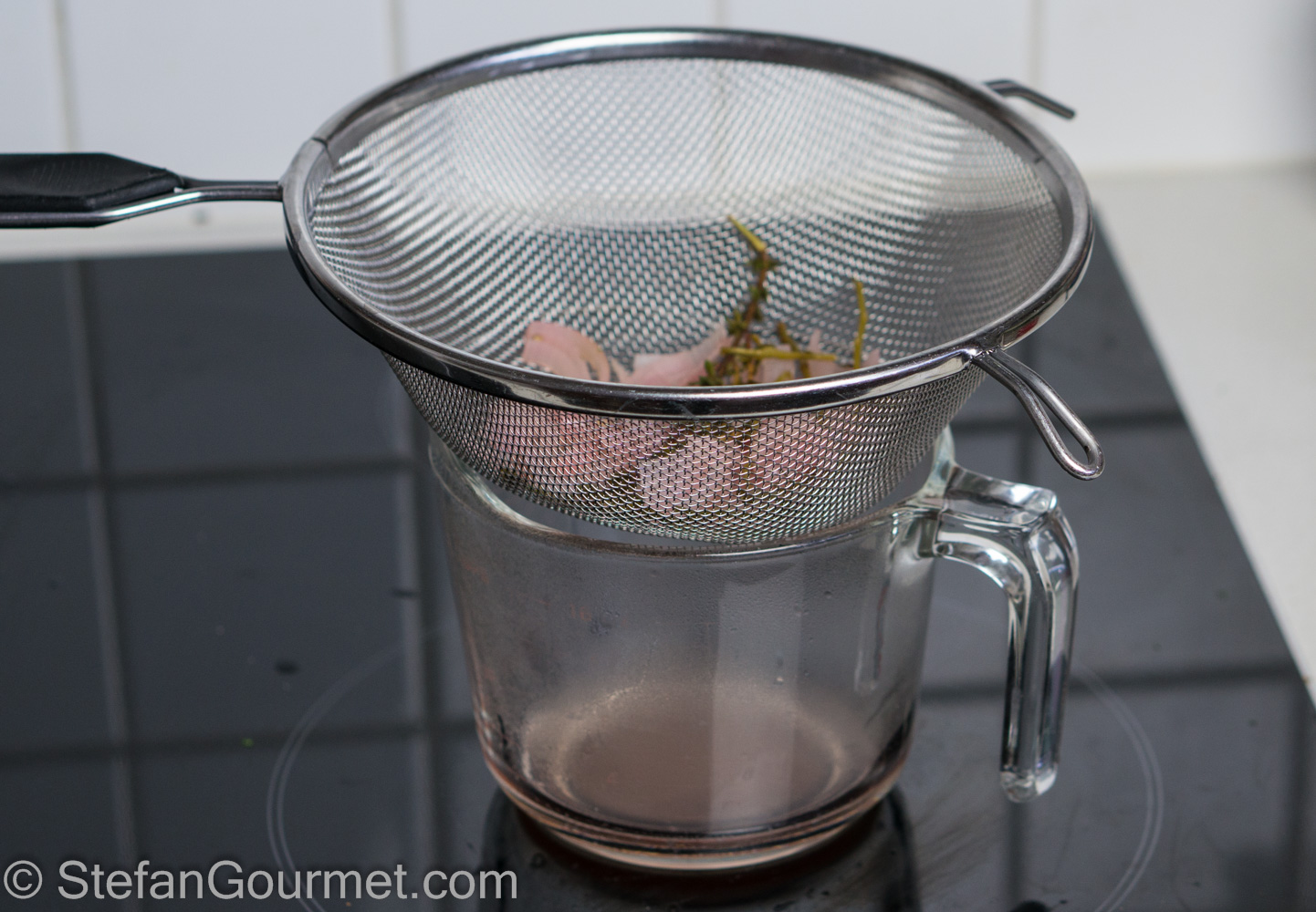 Strain the liquid, pushing down on the shallots. (In Belgium and the Netherlands this liquid is called gastrique, but in France that is something else entirely to make things confusing.)