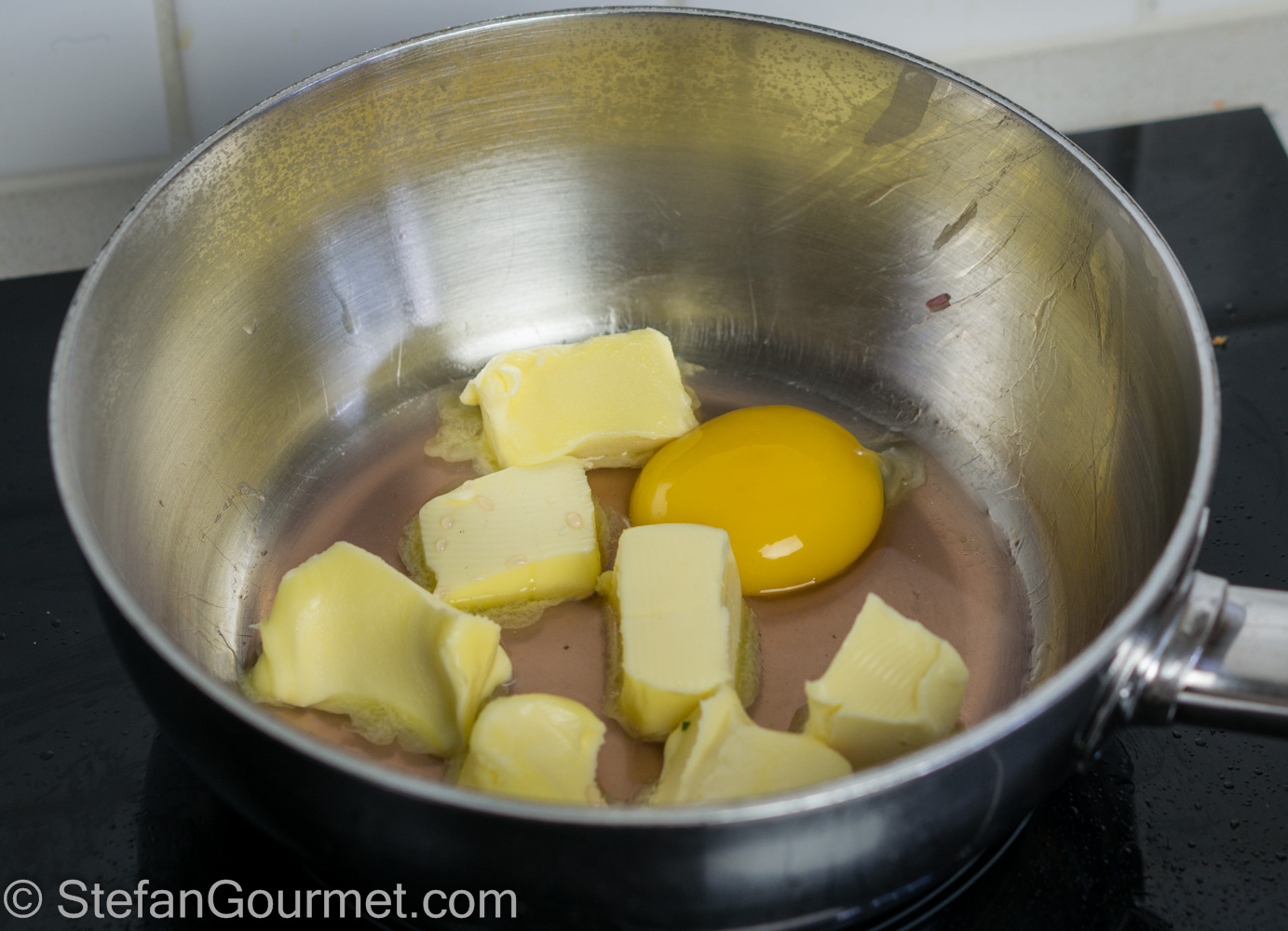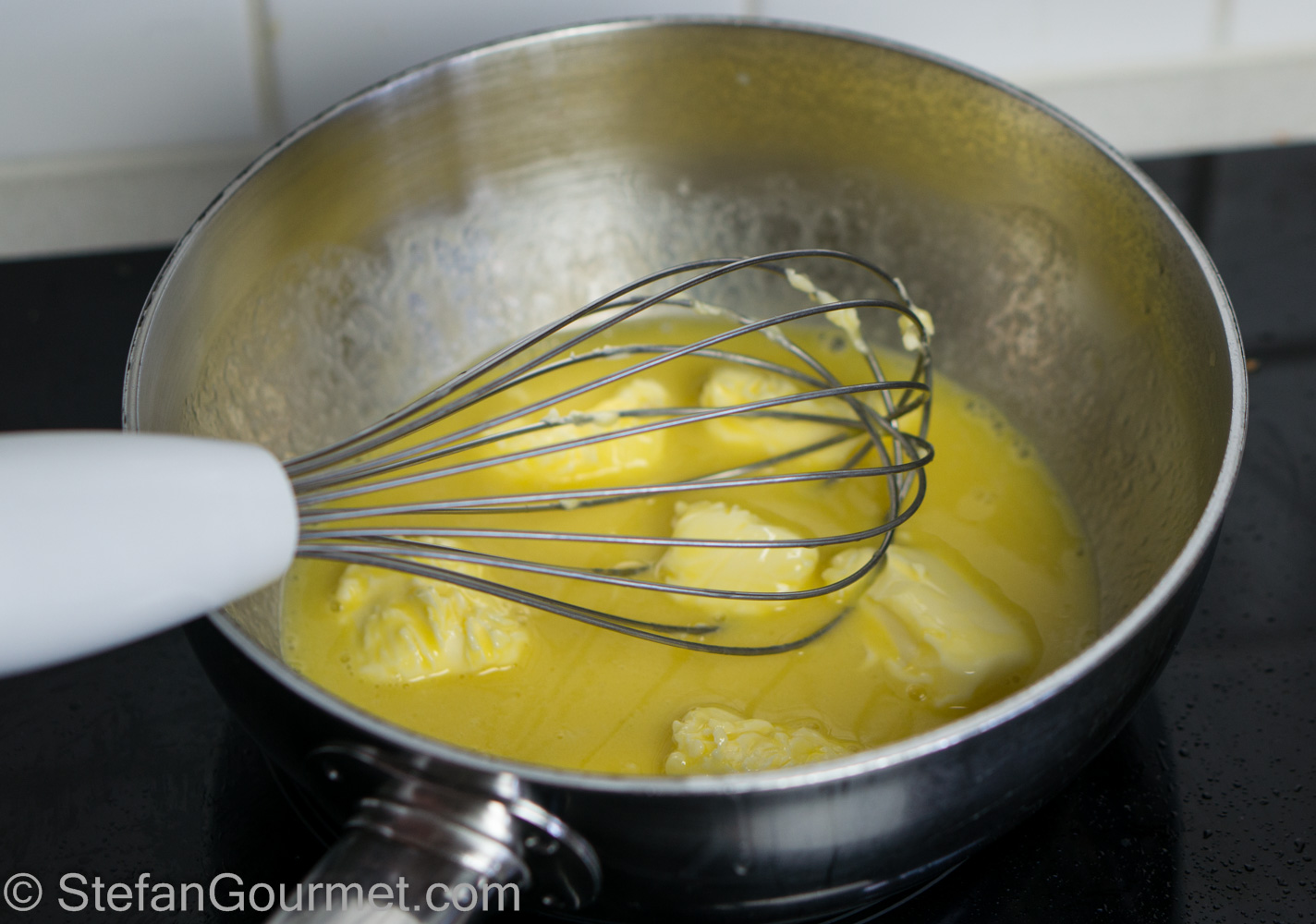 Whisk over low heat so the butter will melt. The heat should be low, otherwise the sauce will curdle after all. Keep whisking after the butter has melted…
