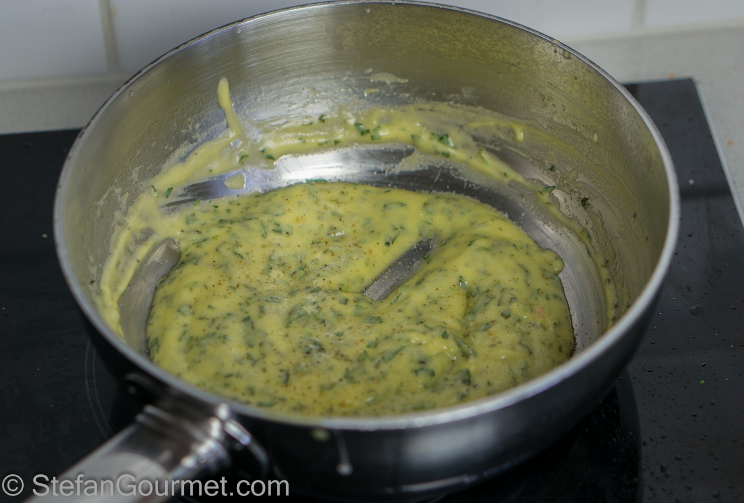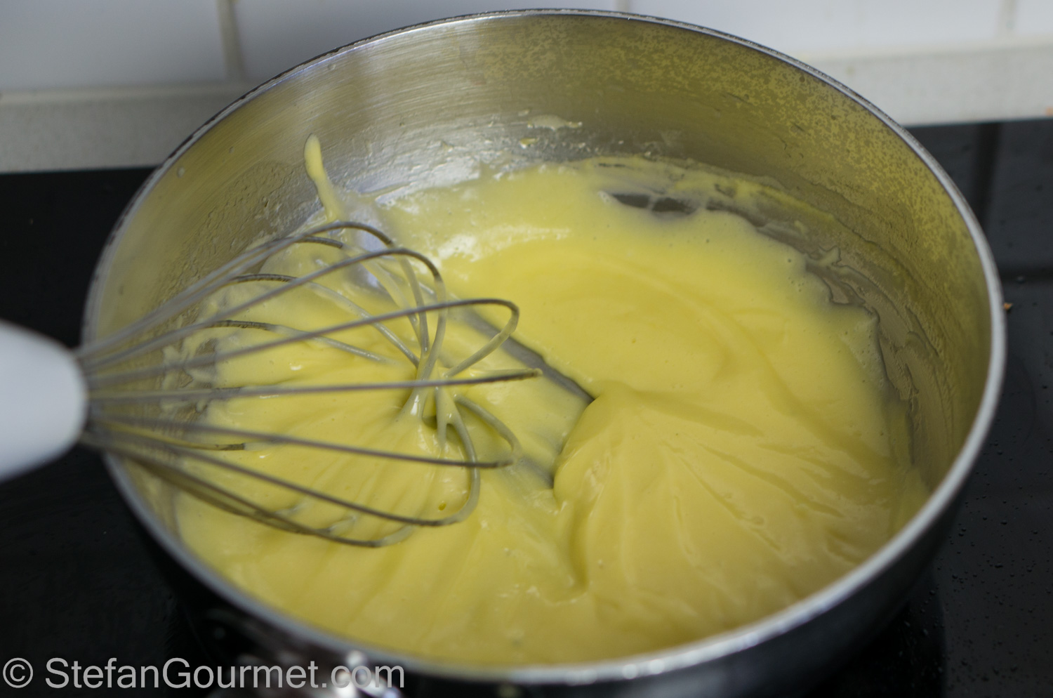 …until the sauce thickens and resembles mayonnaise. This takes about 5 minutes. Now take the pan off the heat, or keep it warm over very very low heat (as otherwise it will curdle).