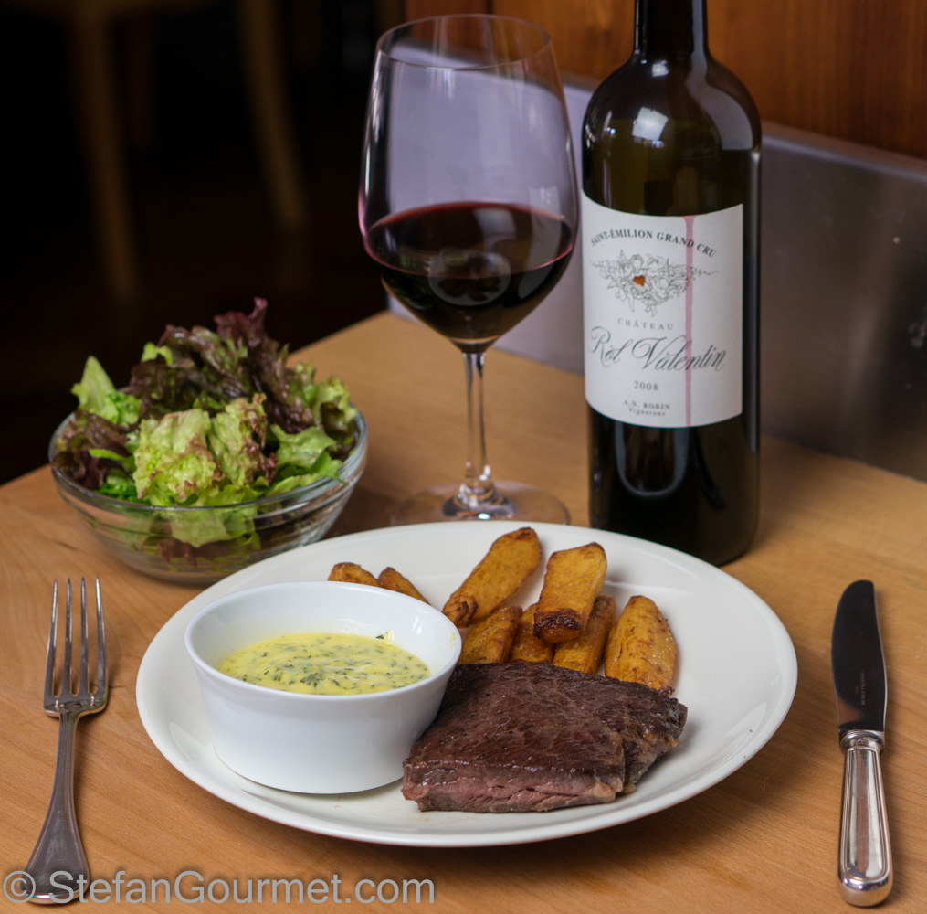 Last night’s dinner: a nice juicy steak cooked sous-vide and then seared quickly in very hot clarified butter, hand cut fries, sauce béarnaise, a green salad, and a nice glass of Saint-Émilion Grand Cru.