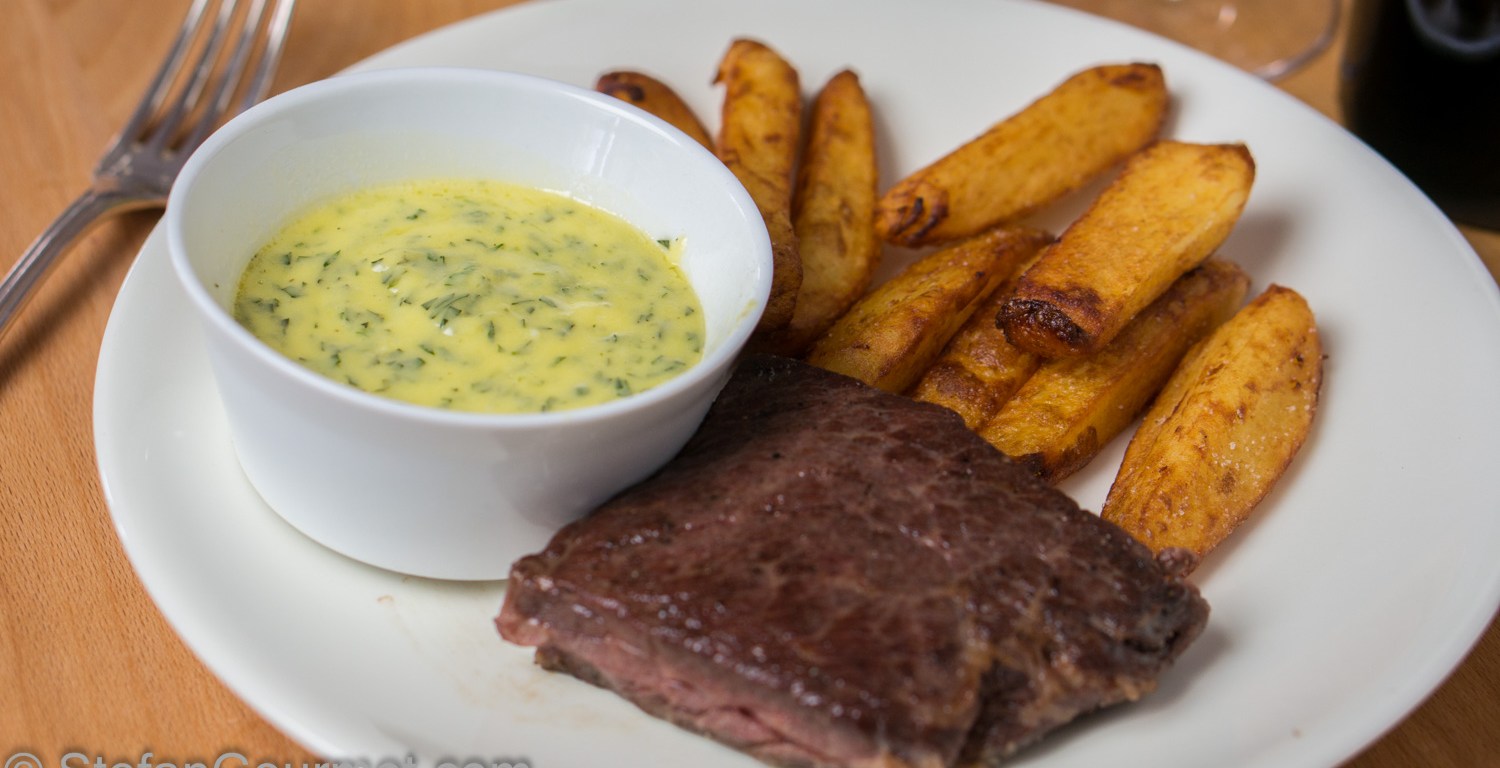 Béarnaise is one of the classic sauces from French cuisine and it is great with steak. The traditional way of preparing it au bain marie requires quite a bit of skill, as the sauces curdles easily. It also requires you to make clarified butter first. And even though you should make clarified butter to cook the steak anyway, using a slightly different technique you can make sauce béarnaise easily with minimal risk of curdling.