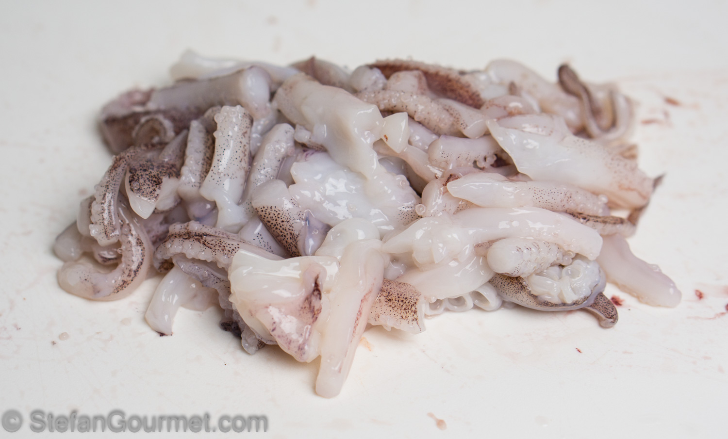 Bring a large pot of water to a boil. In the meantime, prepare the calamari tentacles. Each calamari has 8 tentacles. This is everything below the eye (the eye and everything above is discarded). Cut this into separate tentacles, and each tentacle into 3-5 cm (1-2 inch) pieces. Peel off the skin where you can.