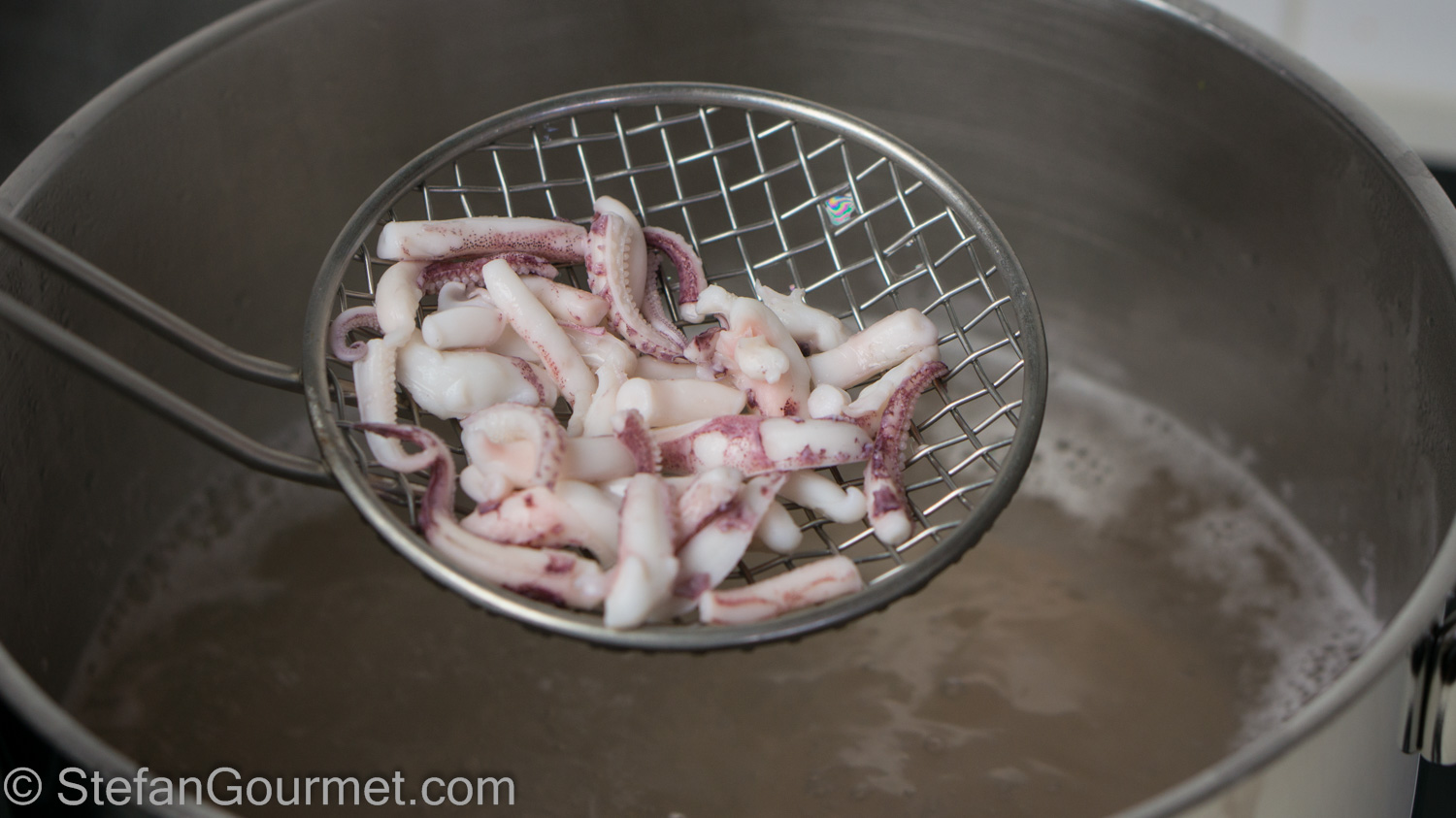 Cook for 30 seconds, not longer, and then remove the calamari with a strainer.