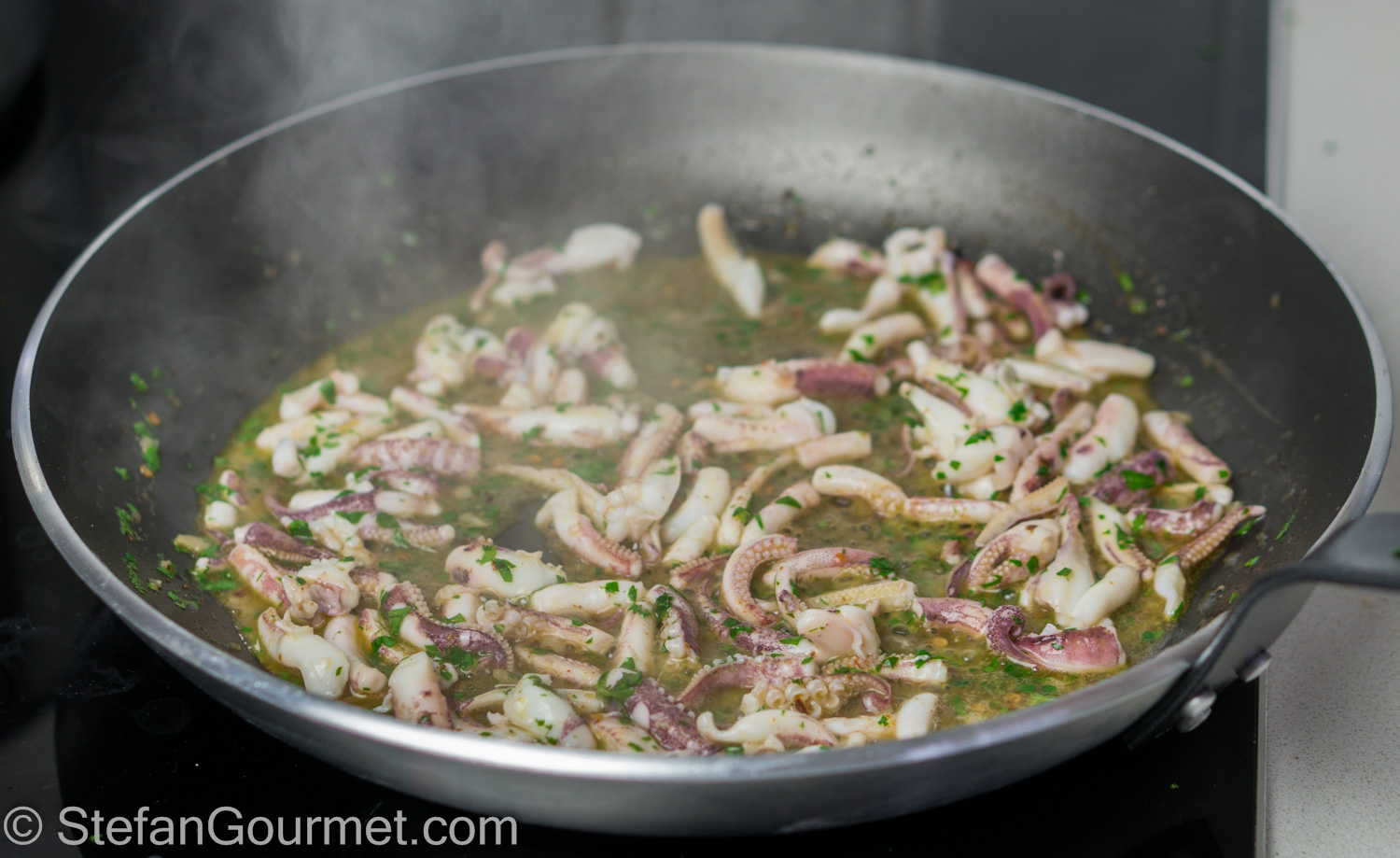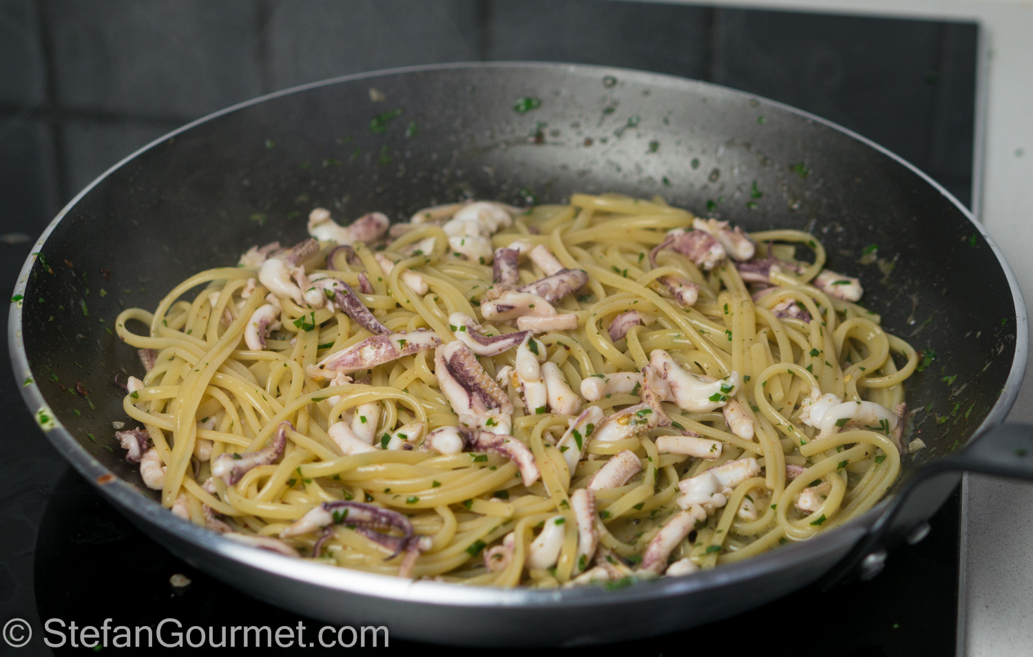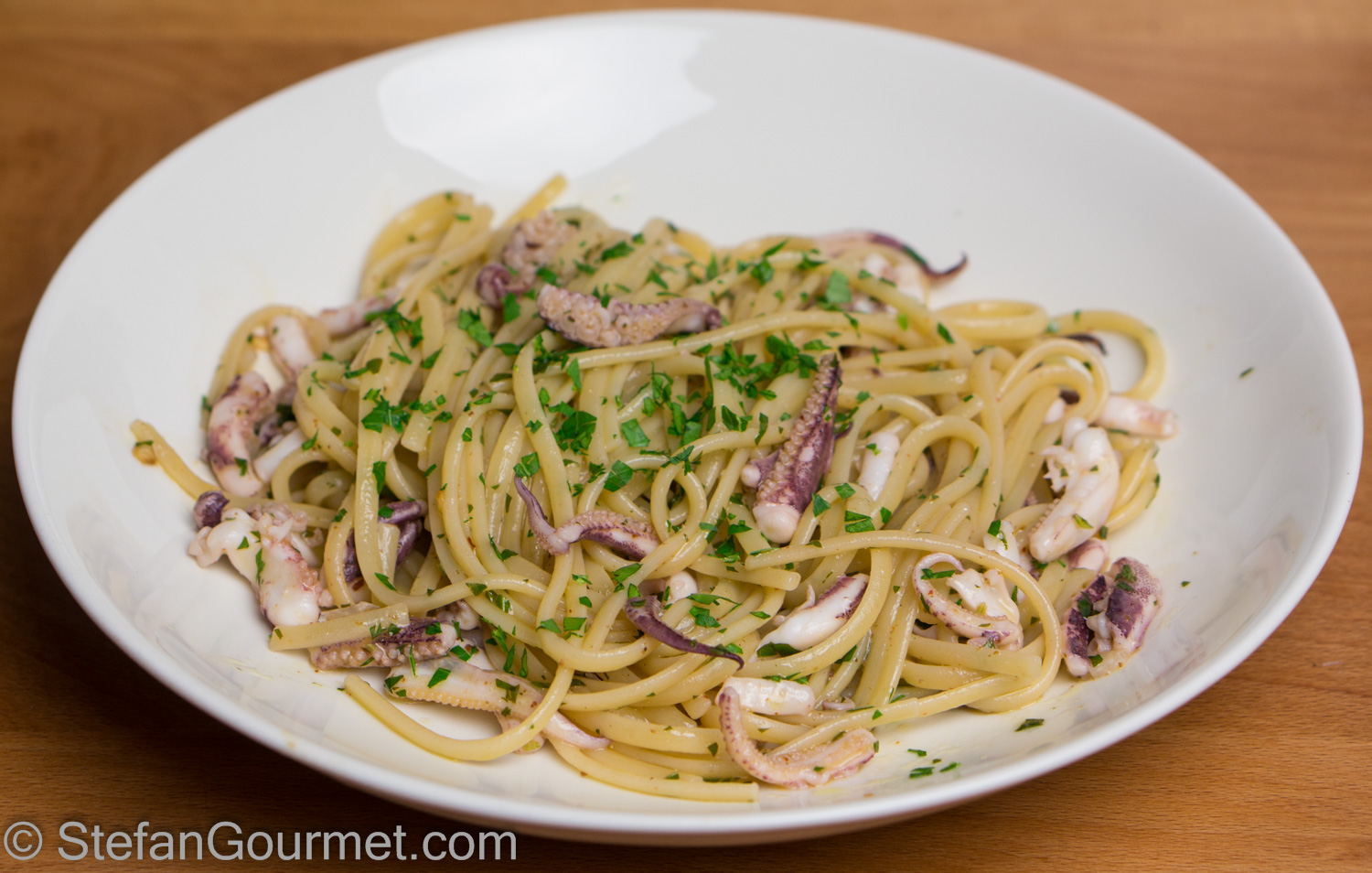 Calamari are mostly known as deep fried rings. They are especially delicious when you make them from fresh calamari. Calamari do not only consist of a body (that is cut into rings) but they also have tentacles. You could deep fry those as well, but you could also use them to make a great pasta dish. It takes about 20 minutes to turn leftover calamari tentacles into linguine ai tentacoli di calamari. It is quick, simple, and delicious. Just like Italian food is supposed to be. Here’s what I did…