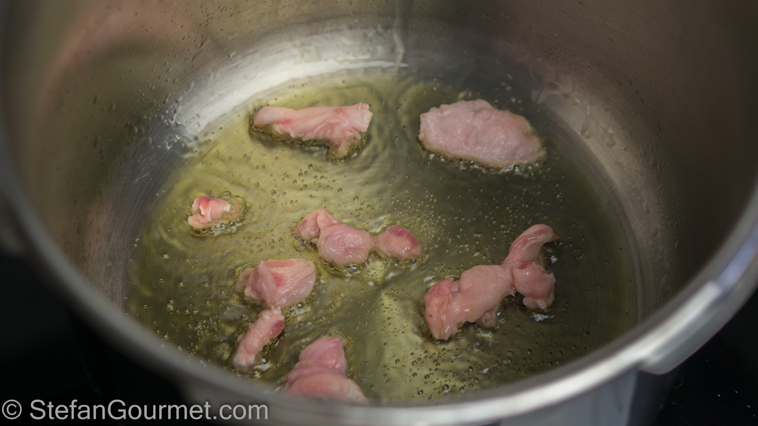 Cook until the fat has rendered from the pieces of fat and they are golden brown. Discard the pieces of fat (or snack on them if you are into crackling).