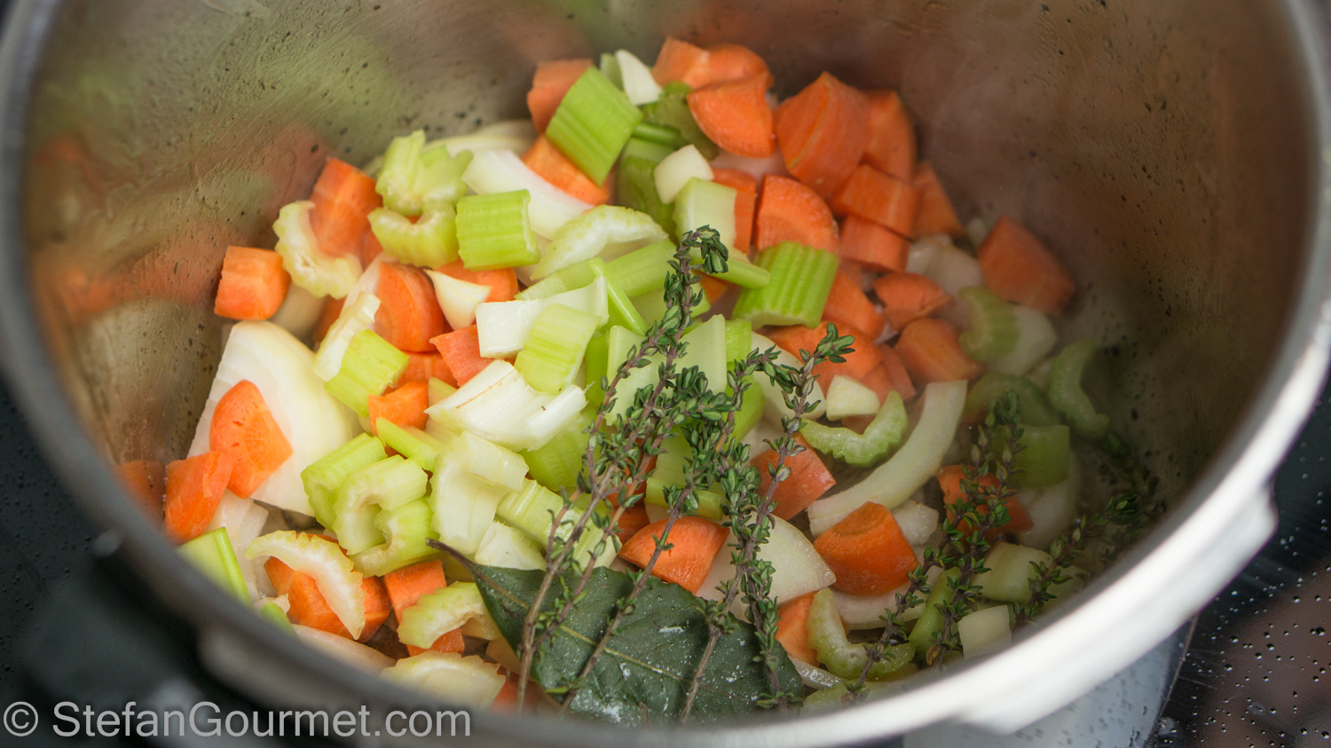 Add the onion, celery, carrot, bay leaf, thyme, and garlic to the stock pot or pressure cooker and sauté over medium high heat.