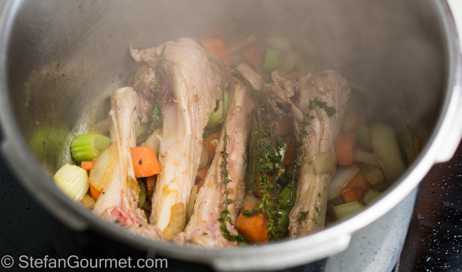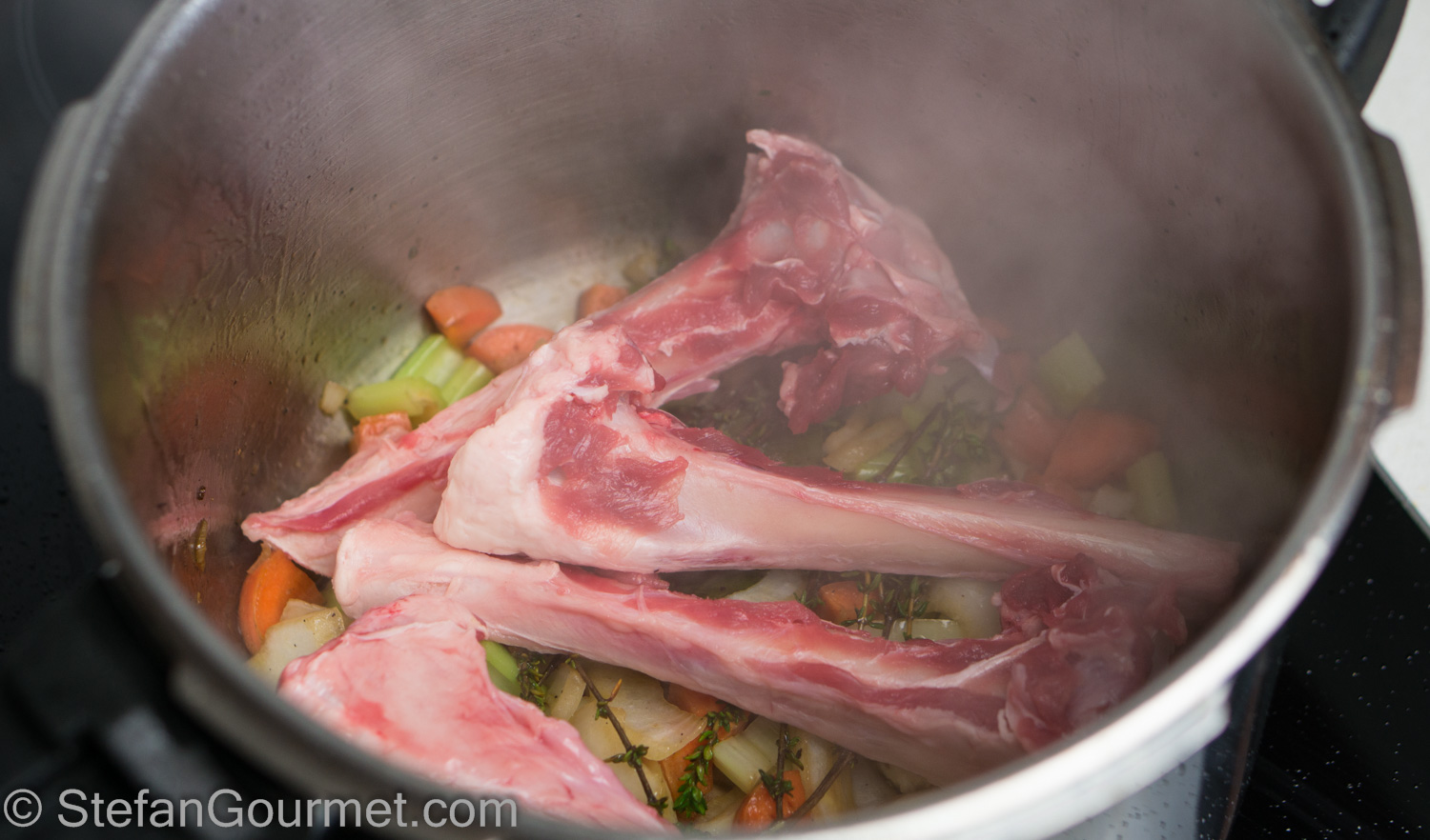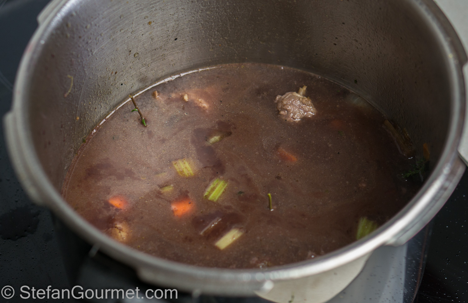 The lamb stock is ready after 2 hours of pressure cooking or 4 hours of simmering.