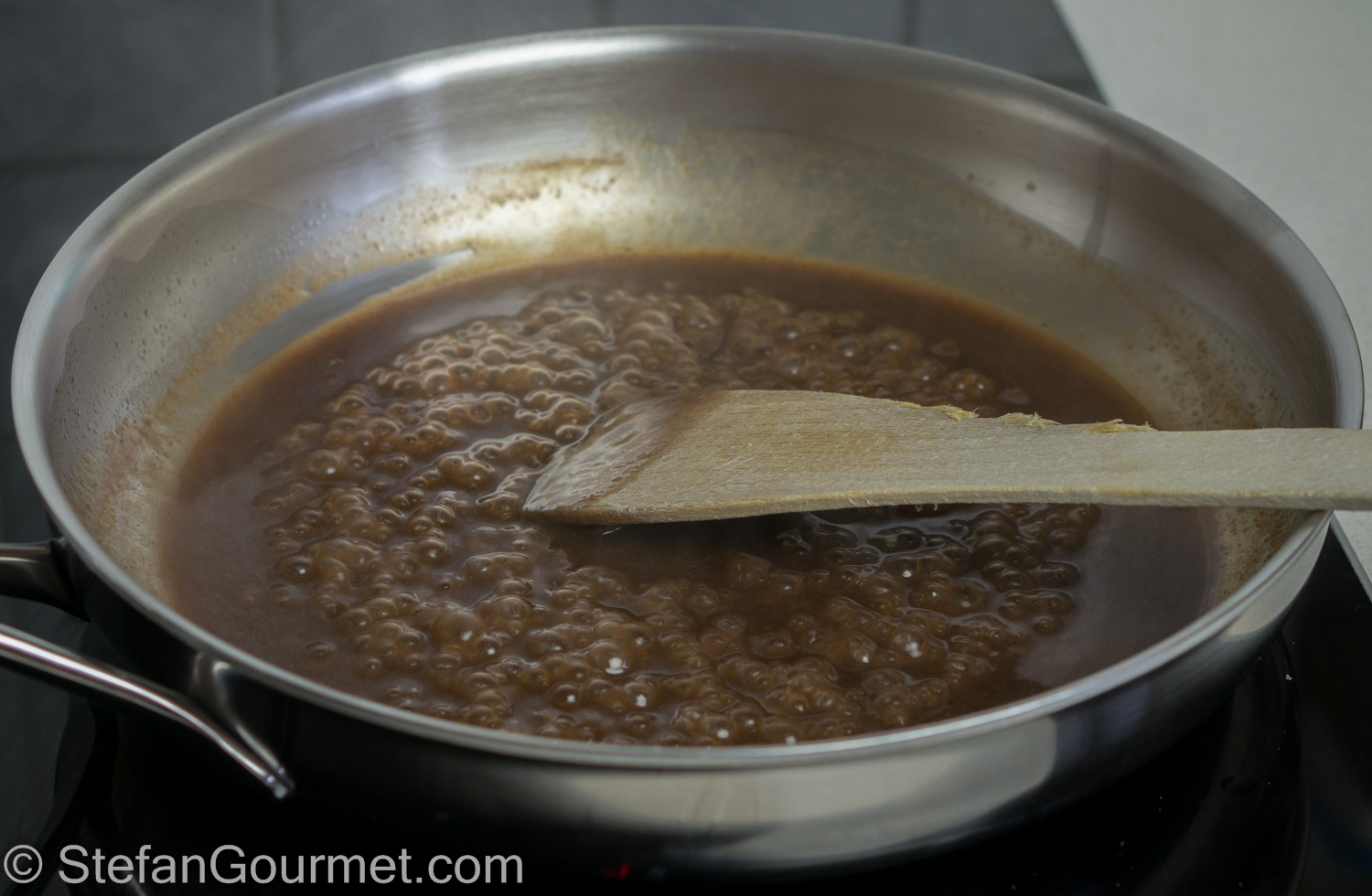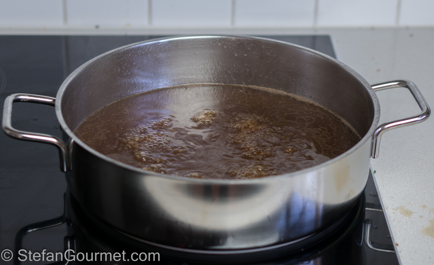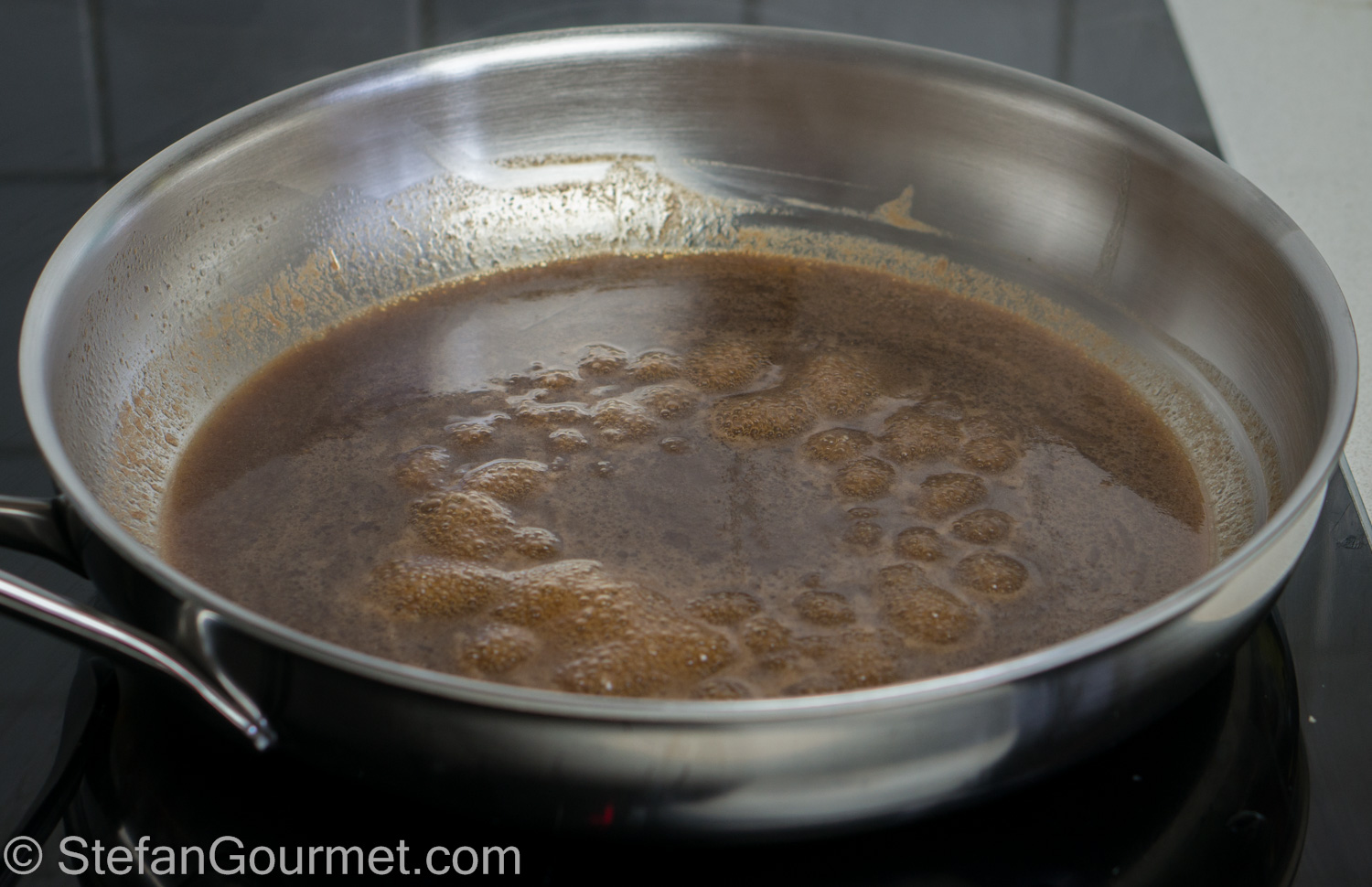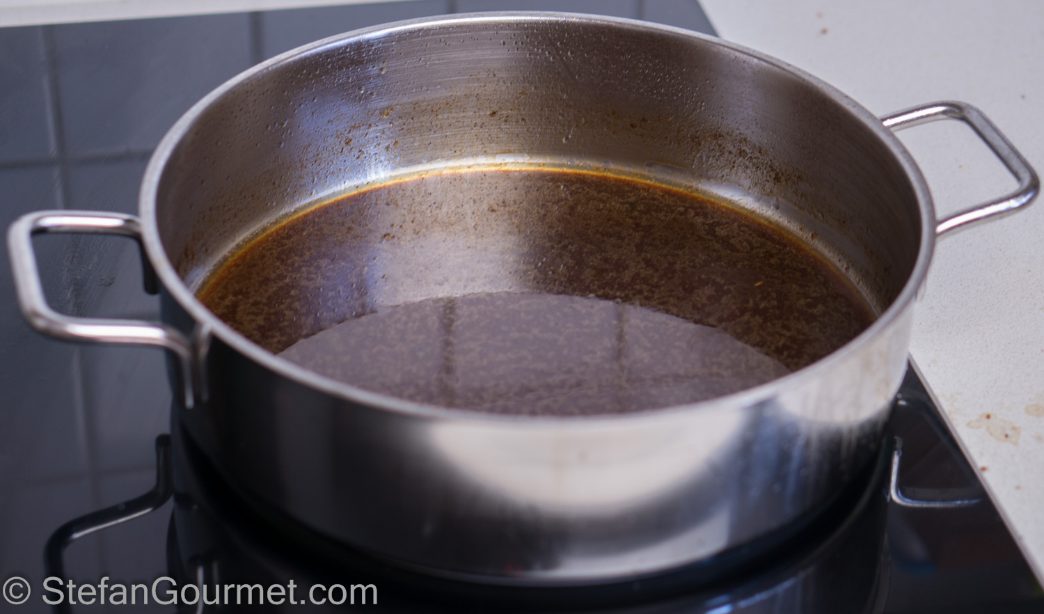 …and simmer until reduced to about 125 ml (1/2 cup). Allow to cool and remove the fat that will float on top.