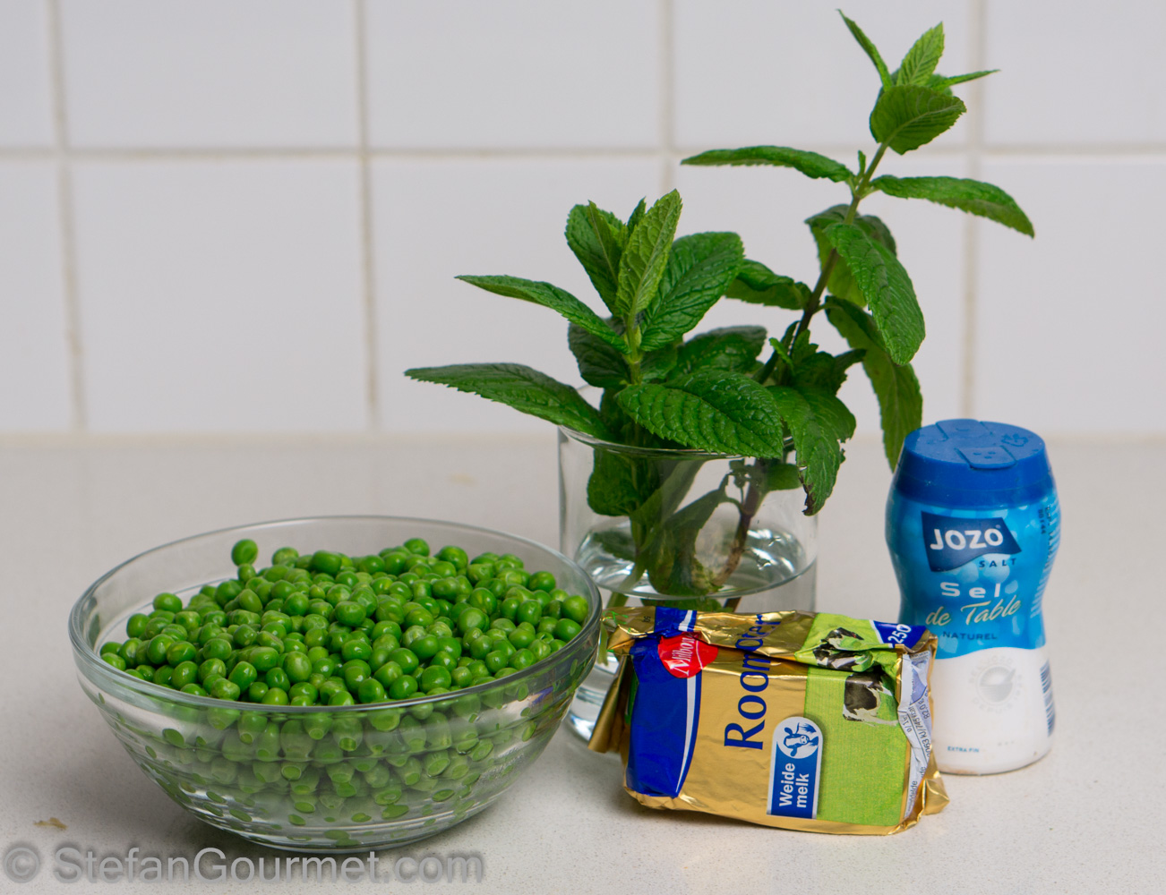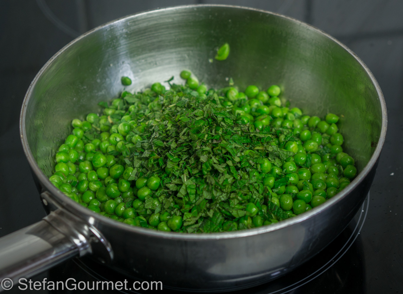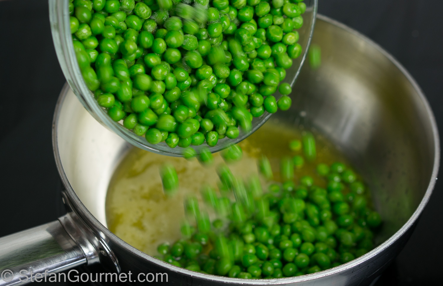 To make the peas, melt the butter in a saucepan and add the peas. Cook them until they are tender but still firm to the bite. When using fresh peas rather than frozen, you may need to add a bit of water. When the peas are cooked to your liking, season with salt.