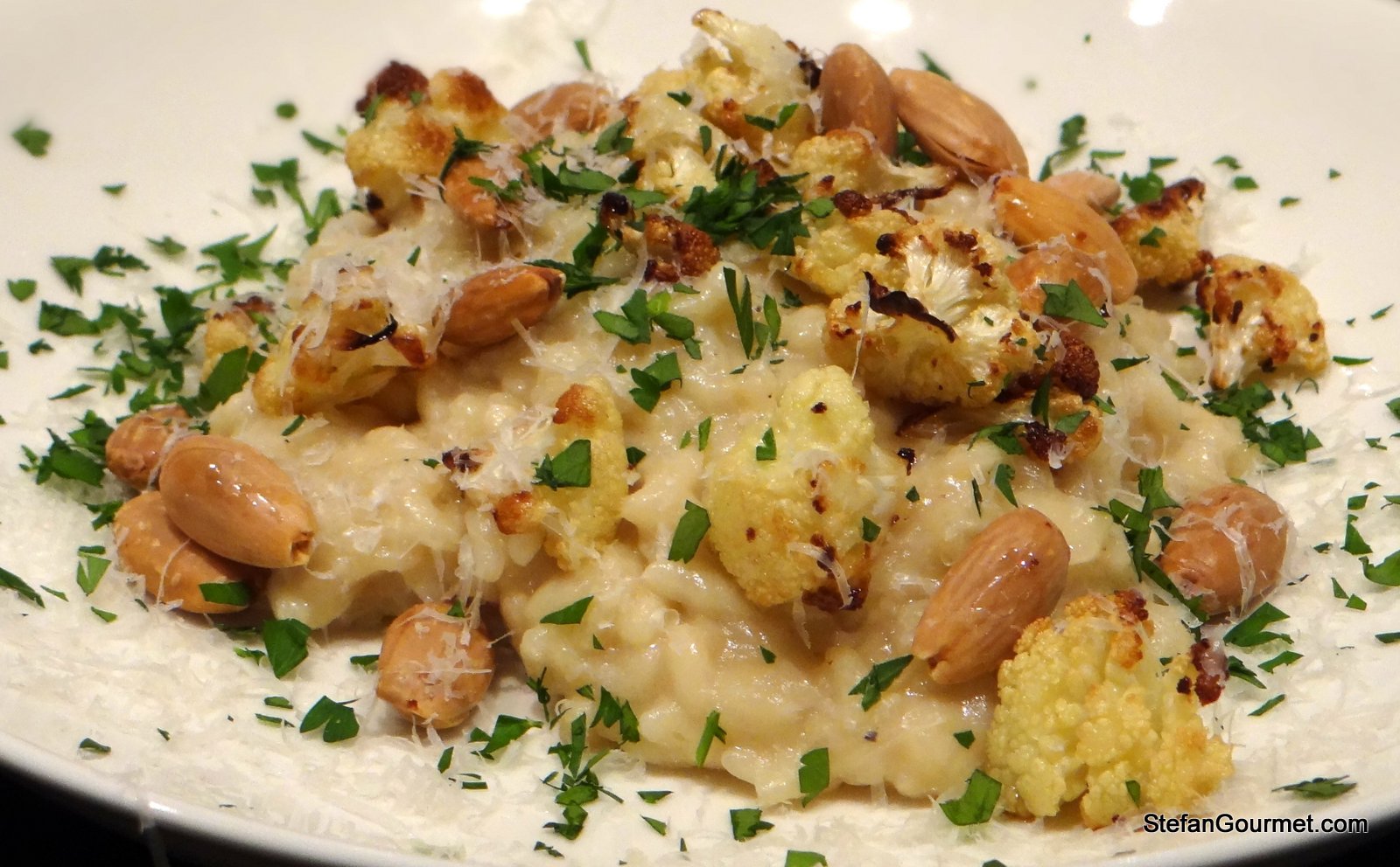 This cauliflower risotto  is very creamy with most of the cauliflower used to make a cauliflower puree and the remainder roasted in the oven for some additional flavor and crunch. As a finishing touch I added some roasted almonds.