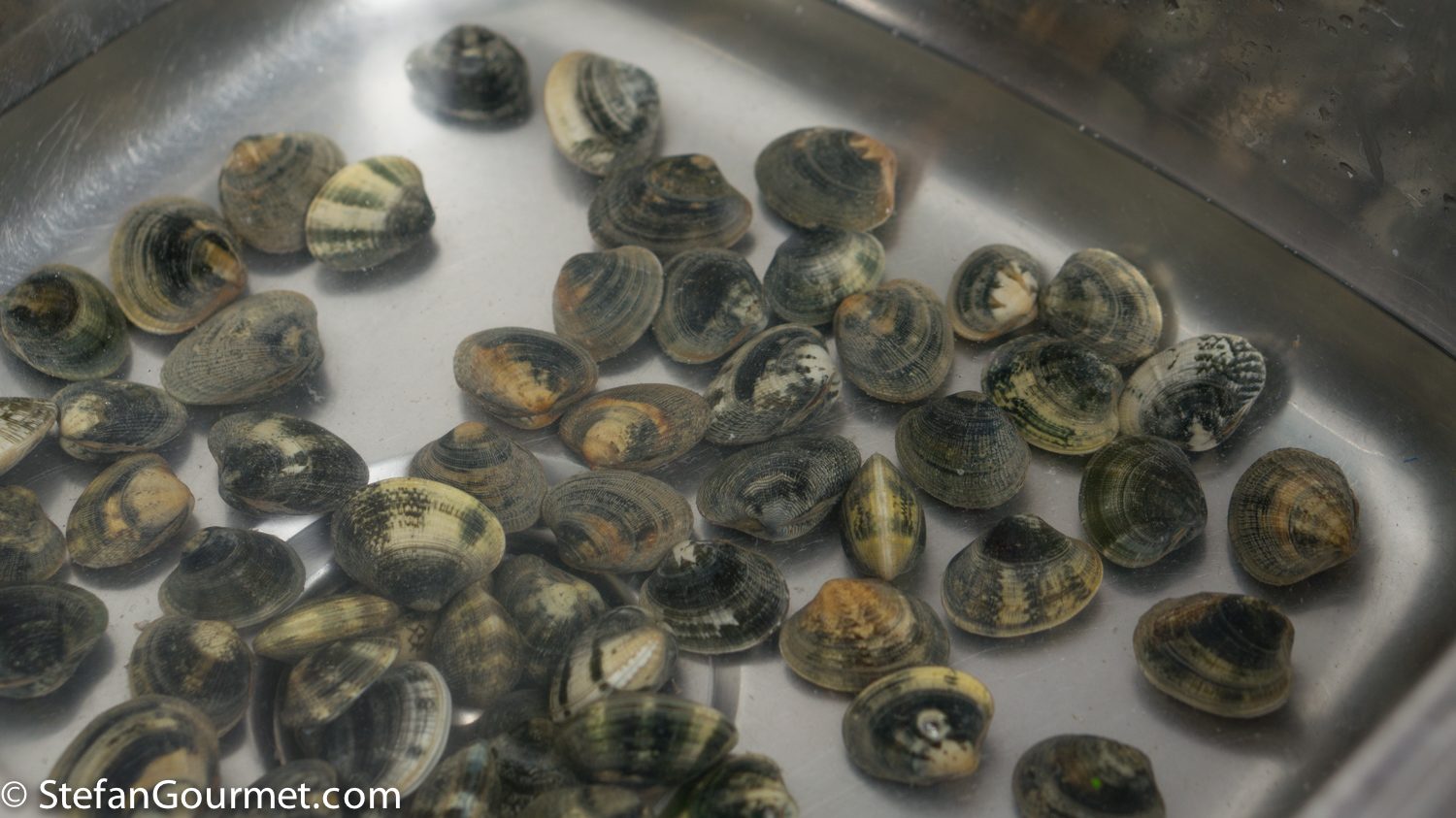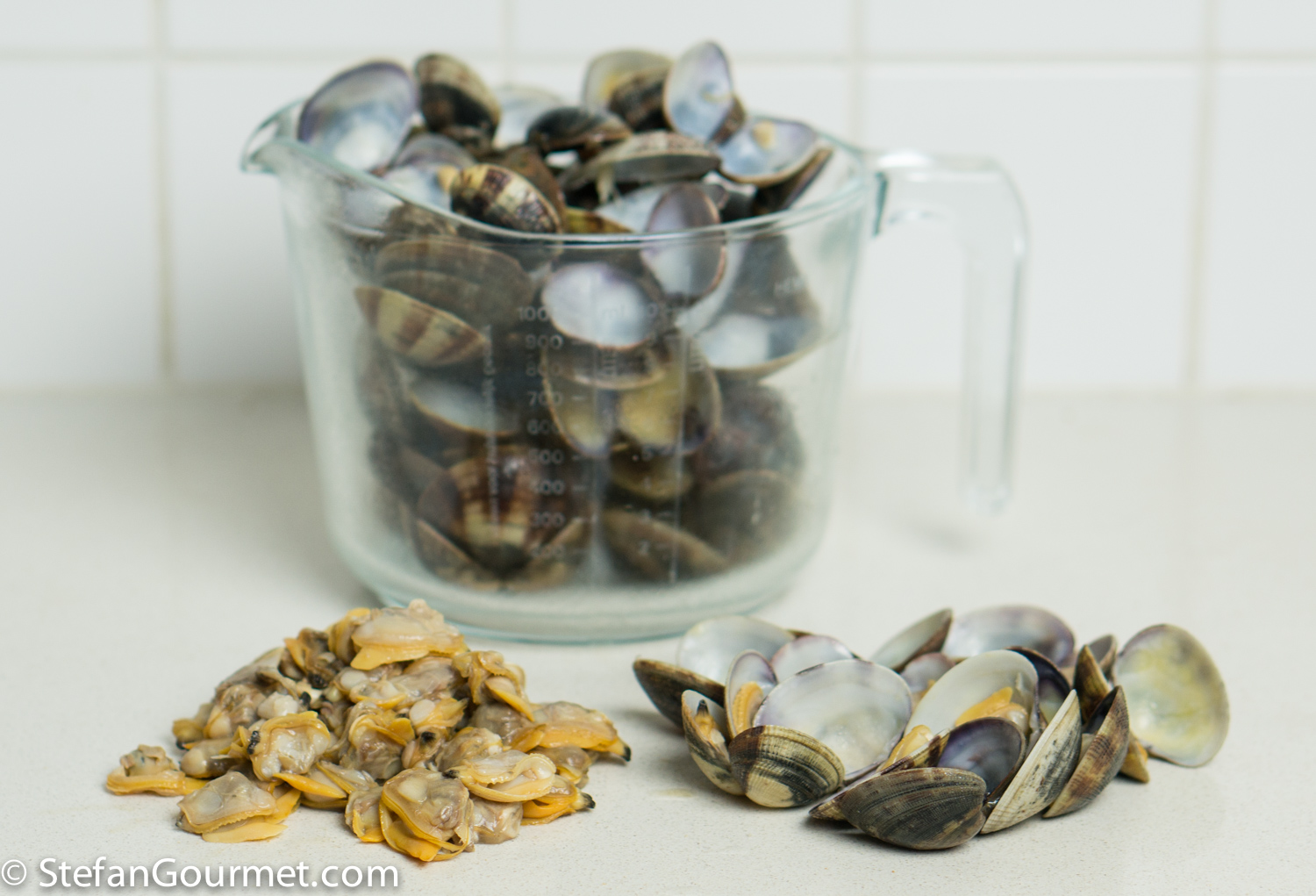 Take most of the clam meat out of the sheels, reserving 12 nice looking clams for garnish.