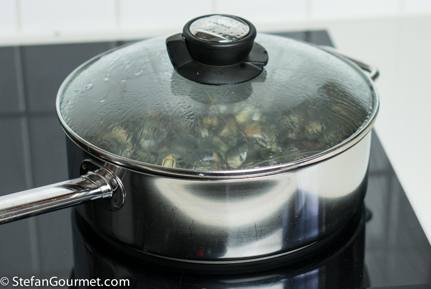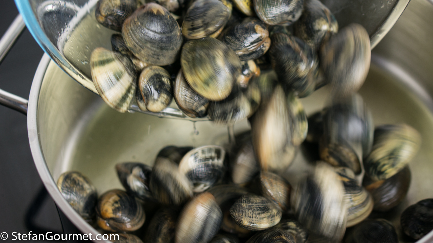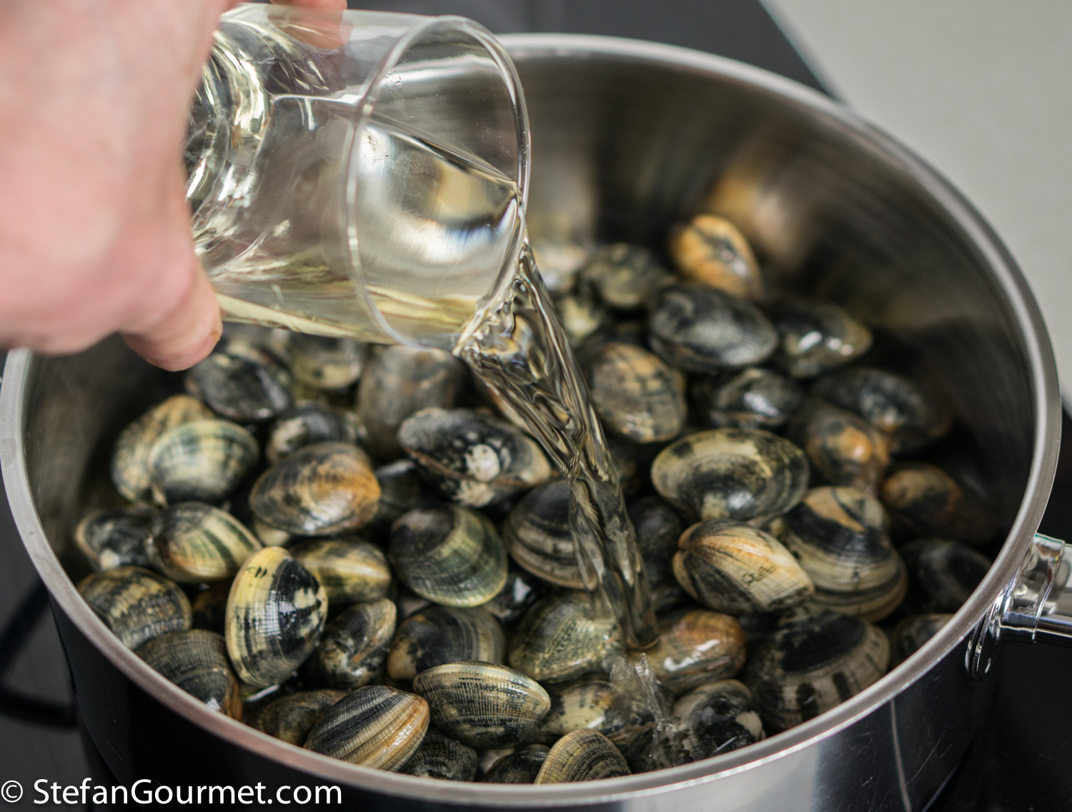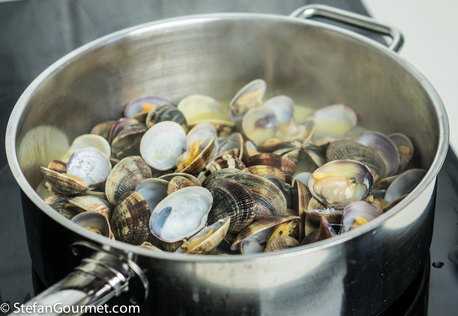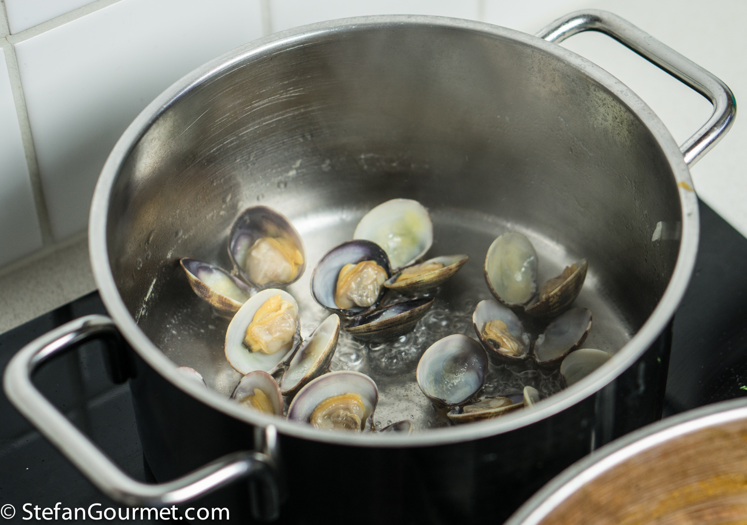 …until the clams have opened. Do not cook them longer than necessary. Turn off the heat.