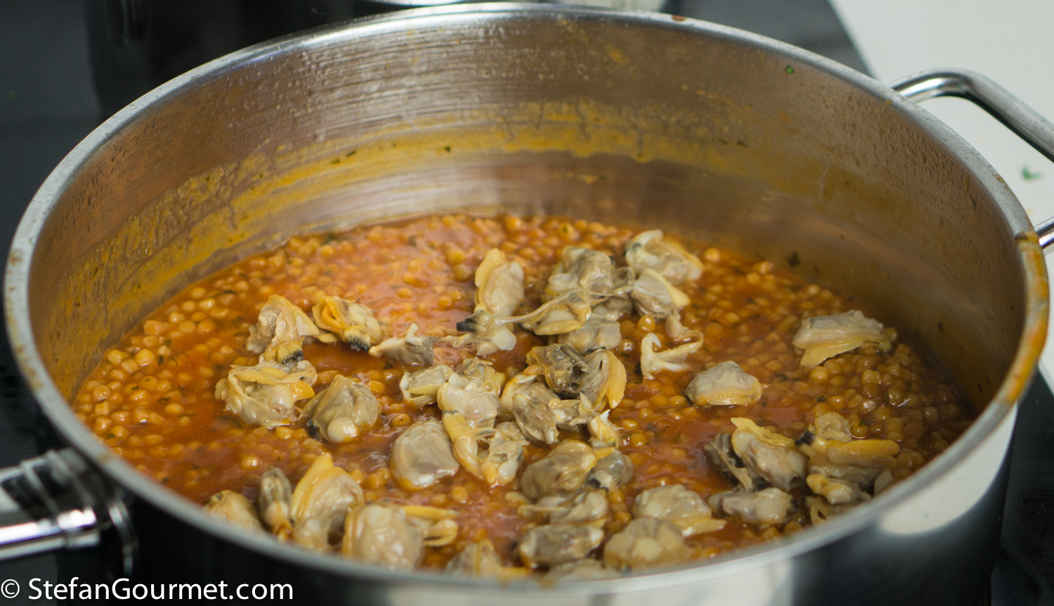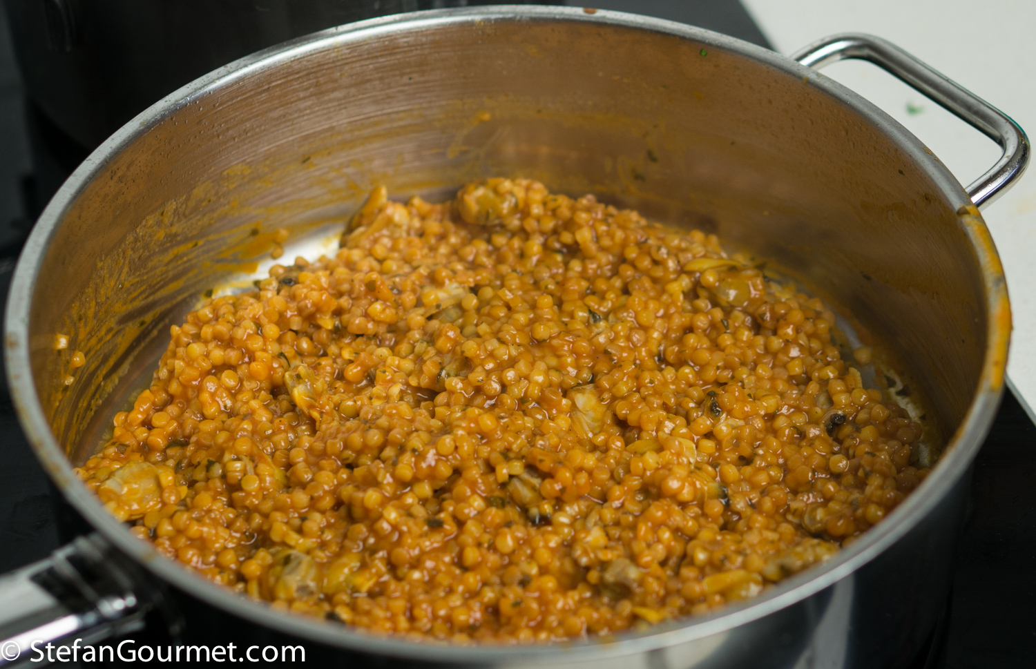 Now cook the fregula as if it were risotto, using the hot clam juices for stock. So add a ladle of the clam juices…