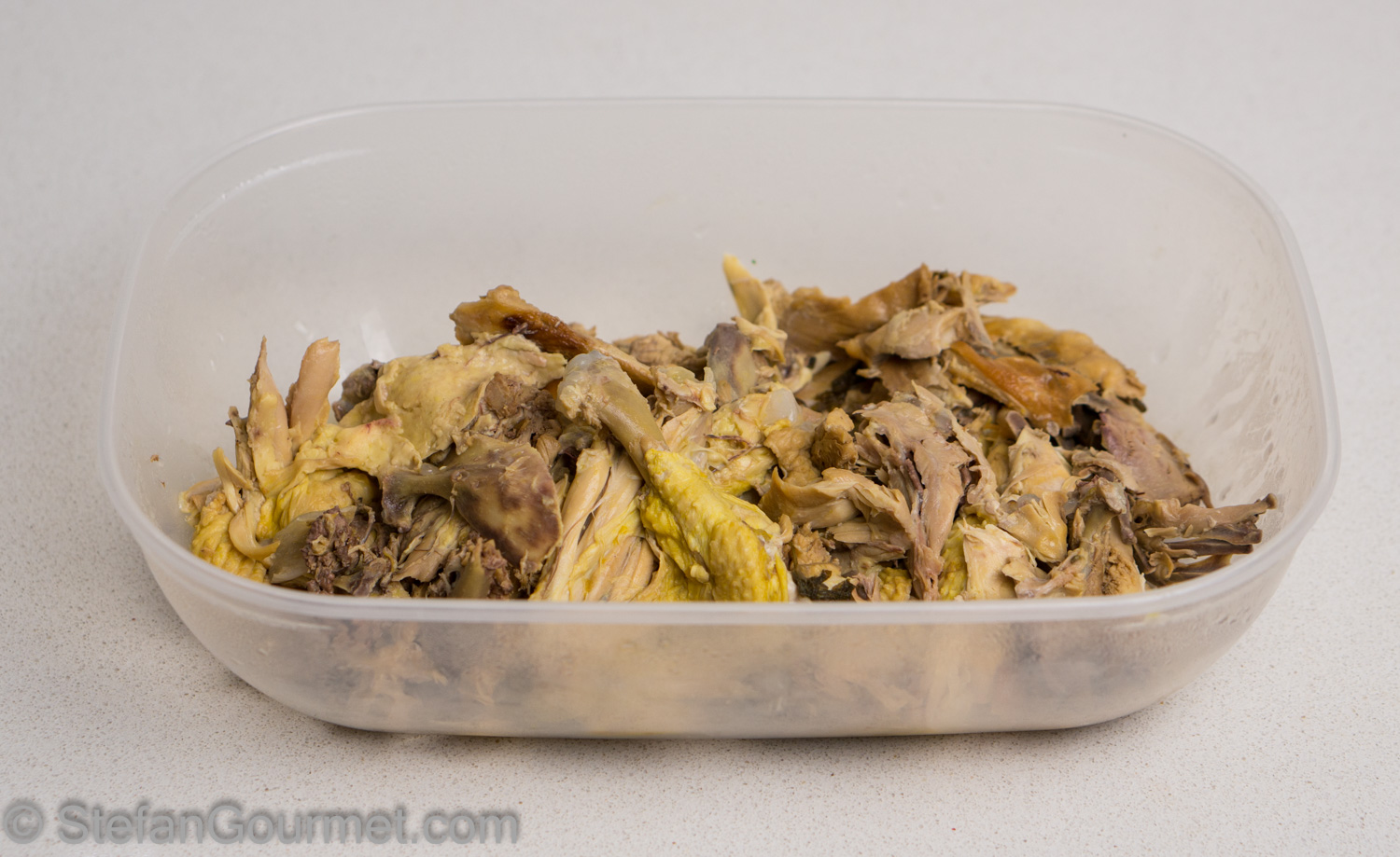 After the fava bean pods there were more leftovers to use up: the meat still attached to the bones from making chicken stock from what was left of the chicken whose legs we had with the fava beans. Although most of the flavor from the meat has ended up in the stock, I have always wondered whether you could still do something with the meat. From the carcass (including wings) of a 1.4 kg chicken, I harvested about 160 grams of cooked chicken meat (or about 11%). I used most of the chicken stock to make the sauce that was served with the chicken leg with fava beans, but there was some leftover stock as well. I had also reserved the fat that floated on top of the stock. By using that as well, we really maxed out this chicken. (We had the breast for dinner on another night — no blog post about that though.)