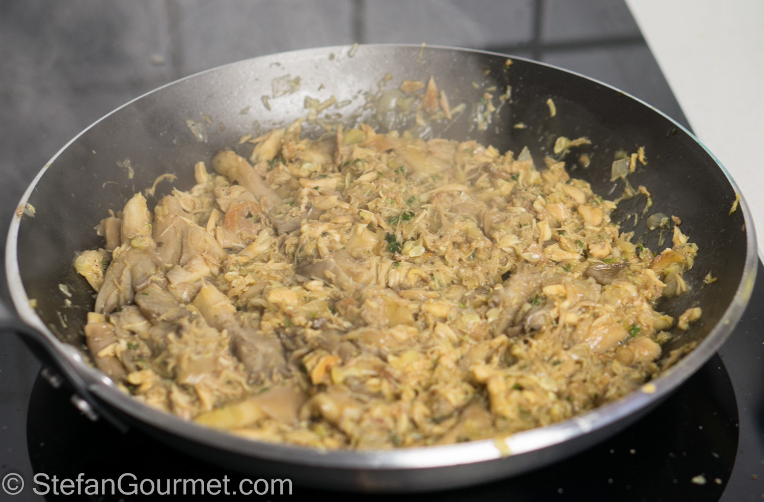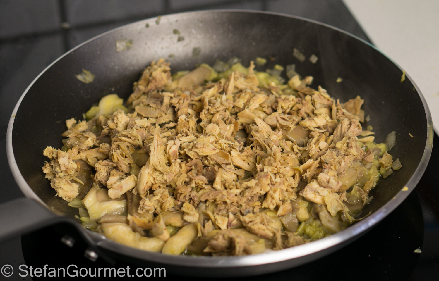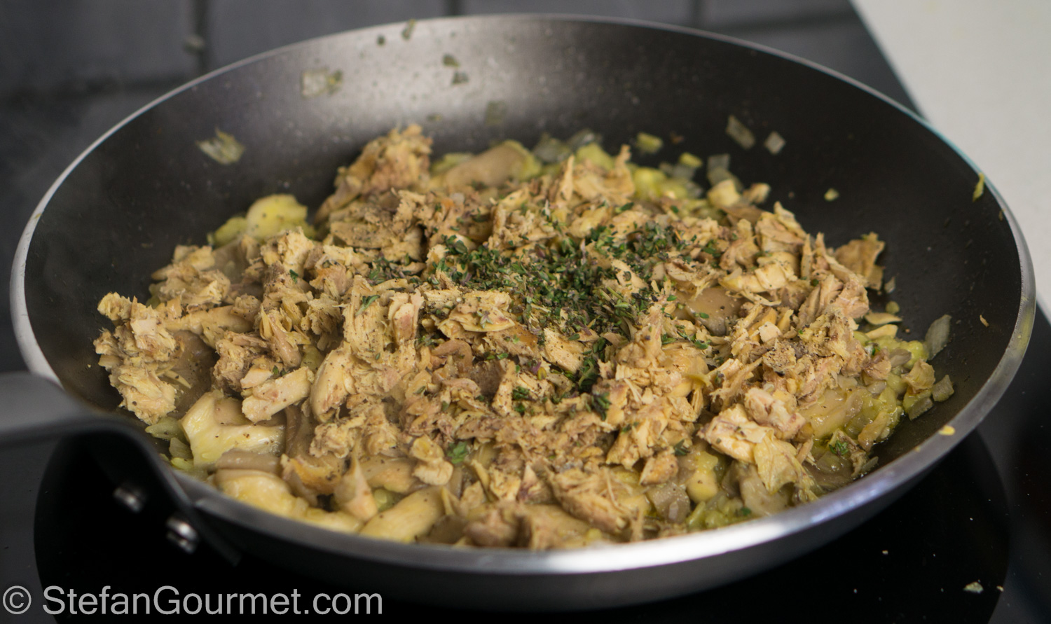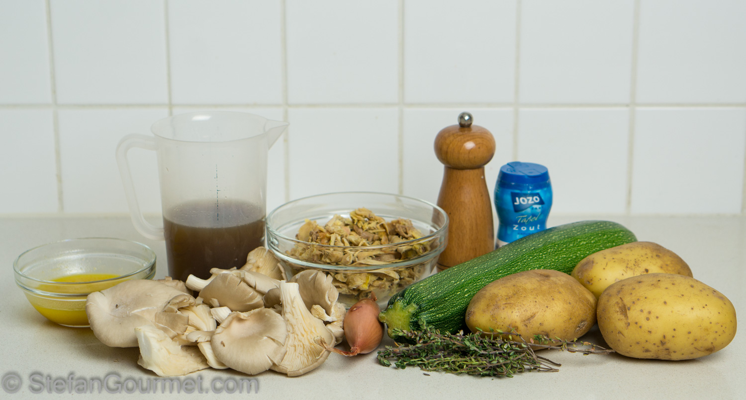 I ended up using the leftover chicken meat to stuff a zucchini, together with oyster mushrooms and topped with cheese. The result was pretty nice, and you could definitely make this with regular chicken meat as well. As expected, the chicken meat leftover from making stock doesn’t have a lot of flavor, but the texture is fine and adding the leftover chicken stock helped. You may get a better result by roasting the carcass and picking the meat rather than making stock as well, but then you won’t have stock for the sauce like I did. I served this with roasted potatoes and it was a nice meal. Here’s what I did…
