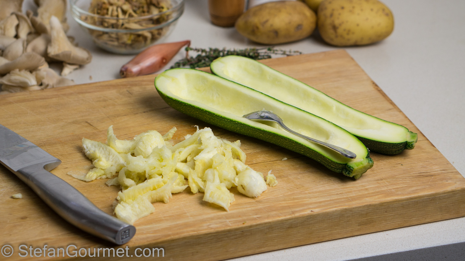 Cut the zucchini in half lengthwise and scoop out the seeds with a spoon. Reserve the seeds.