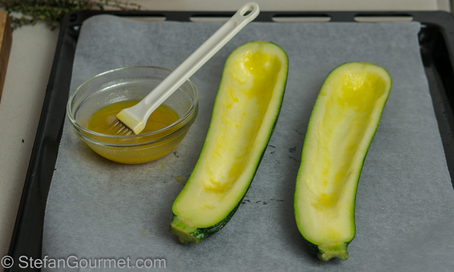 Brush the zucchini inside and out with 2 Tbsp of chicken fat.