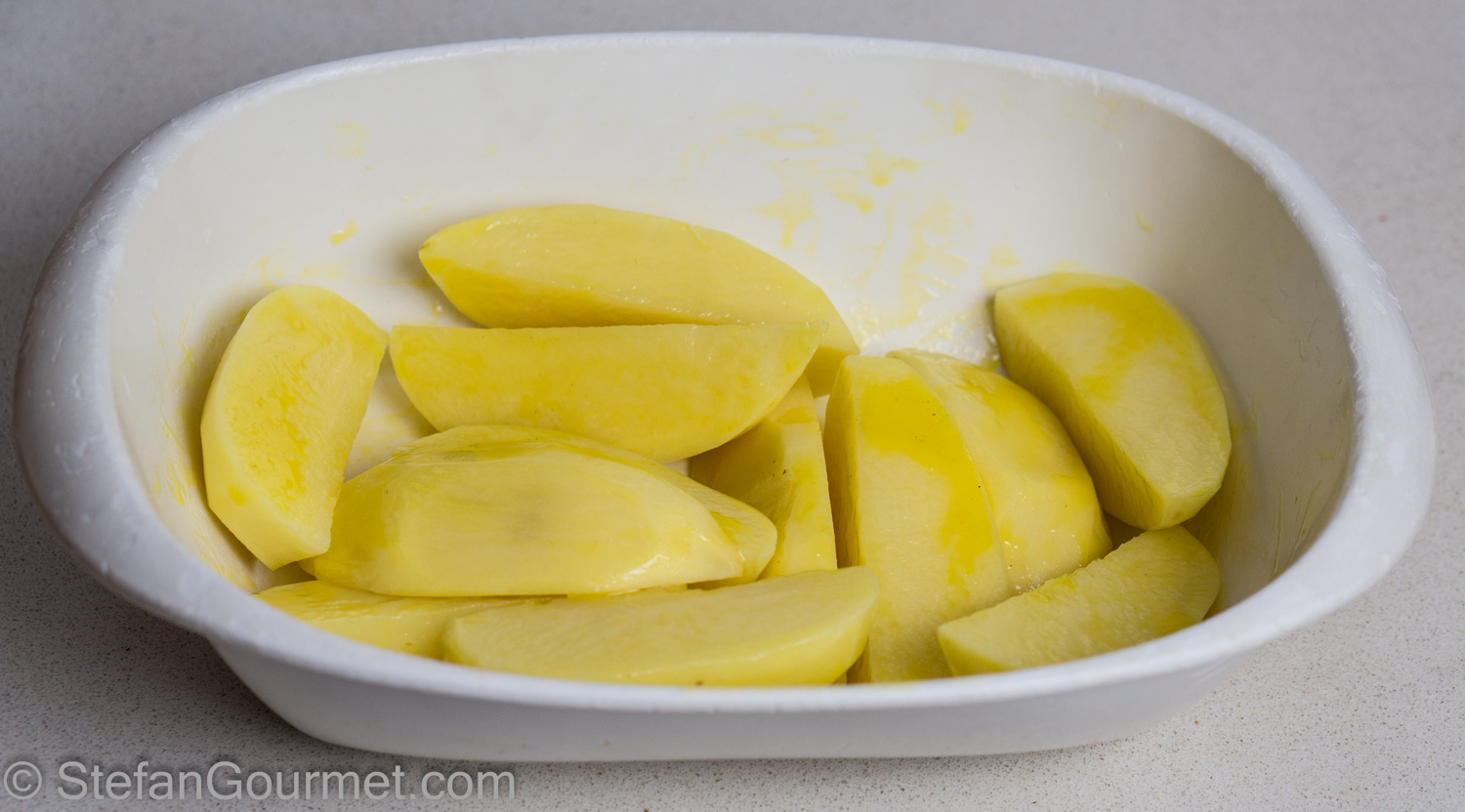 Peel the potatoes, cut them in quarters, and toss with 2 Tbsp chicken fat.