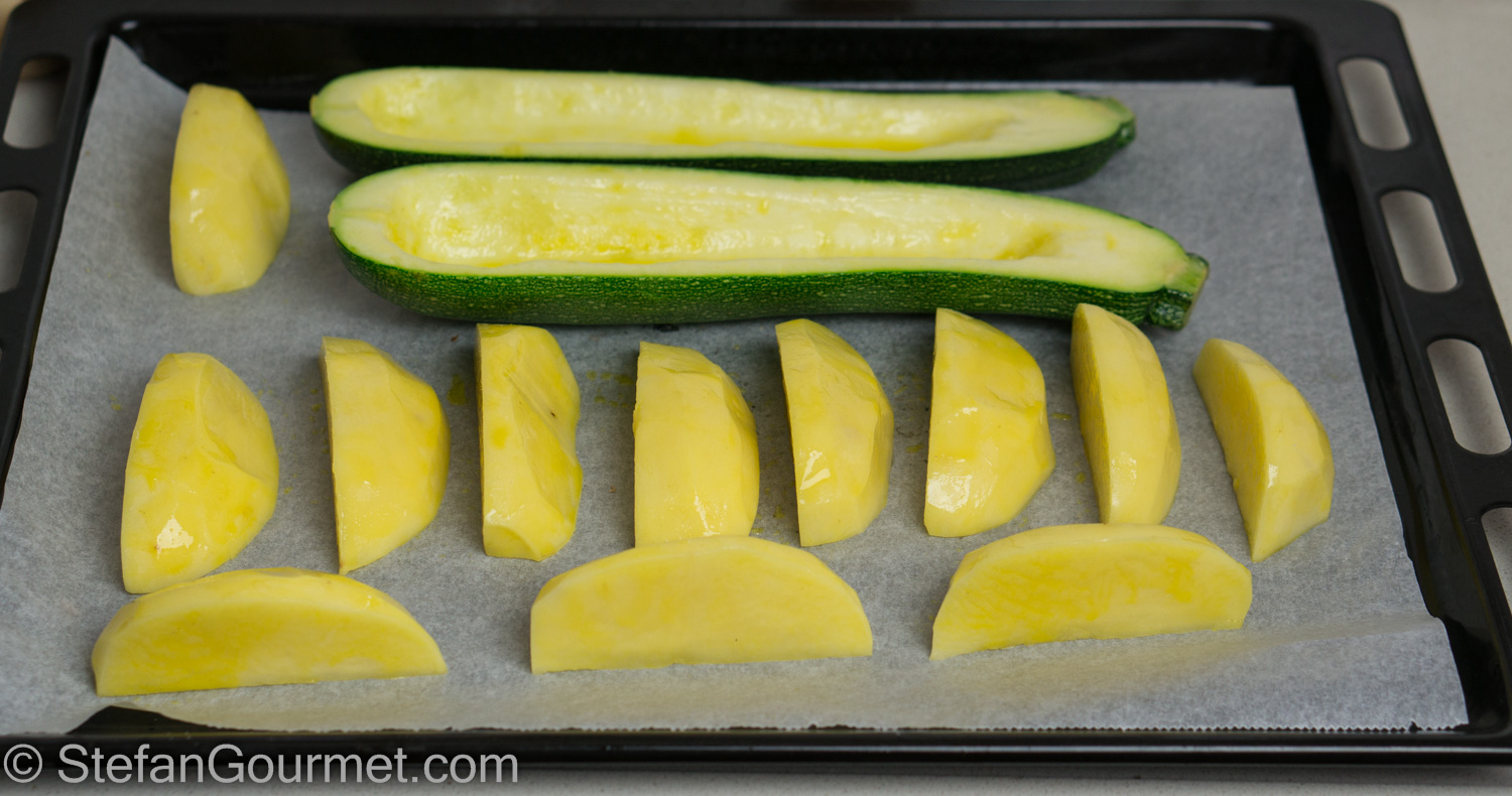 Arrange the zucchini and potato wedges on a baking sheet lined with parchment paper.
