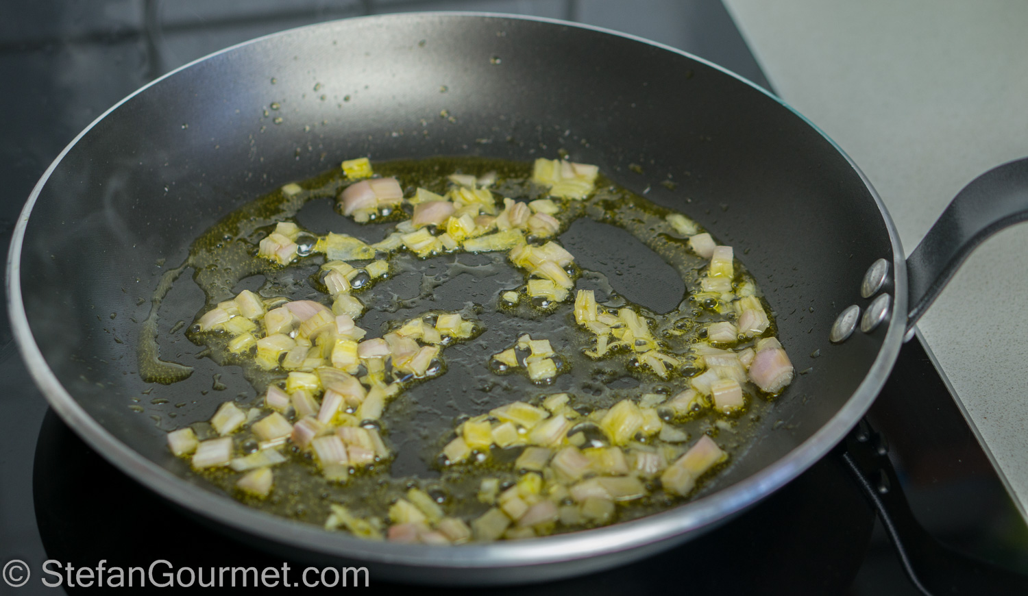 Meanwhile, heat the remaining 2 Tbsp of chicken fat in a frying pan. Add the shallot and sauté until translucent.