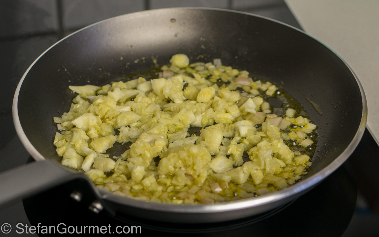 Chop the reserved zucchini seeds and add to the shallots.