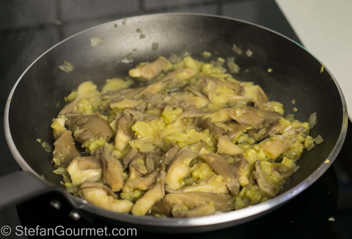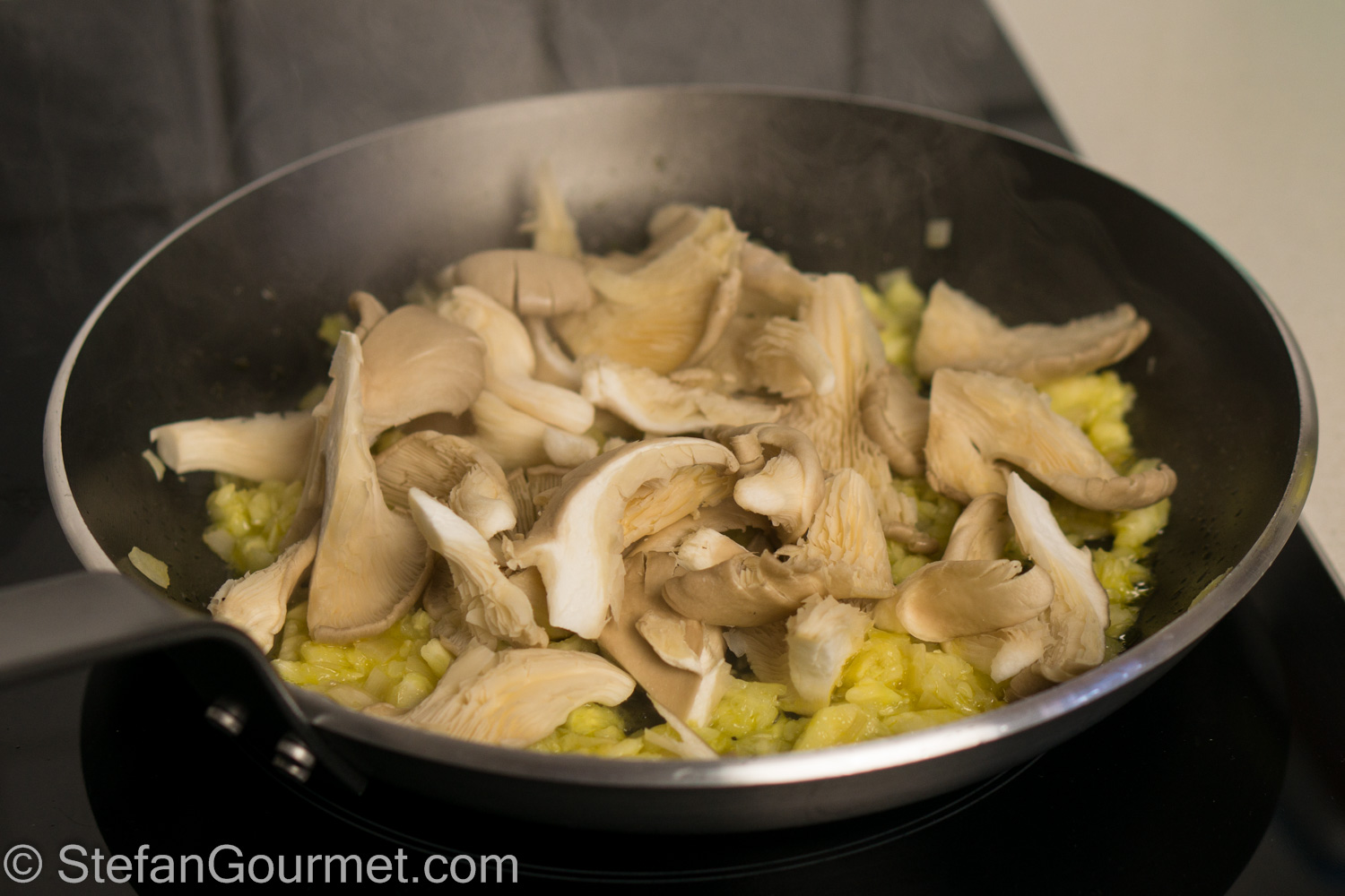 Add the sliced oyster mushrooms and season with salt.