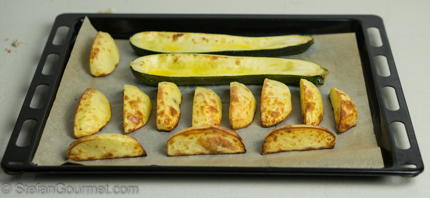 Roast for about 20 minutes at 225ºC/440ºF until the potatoes and zucchini are golden.