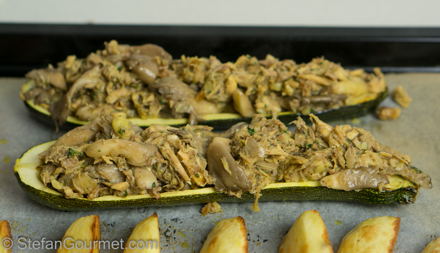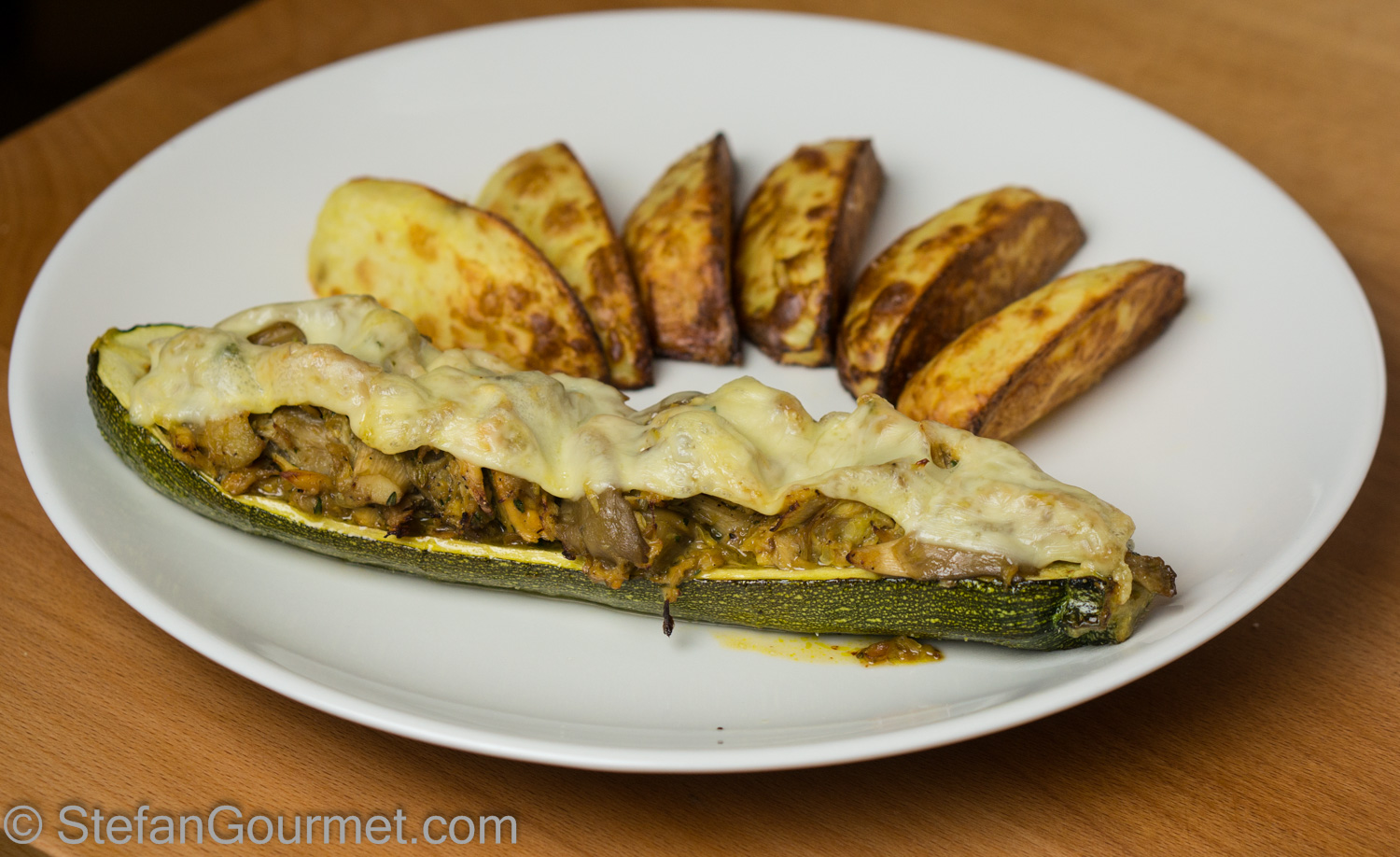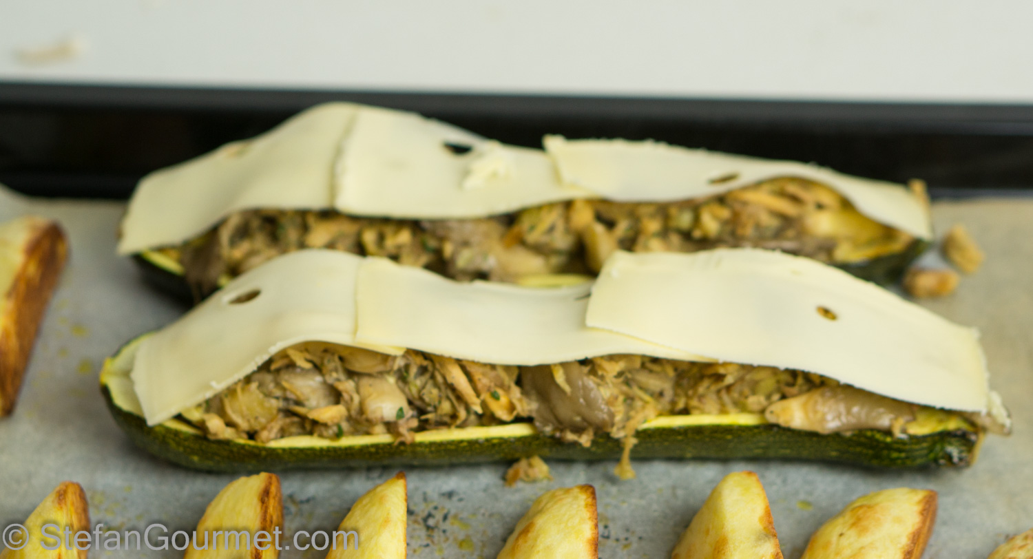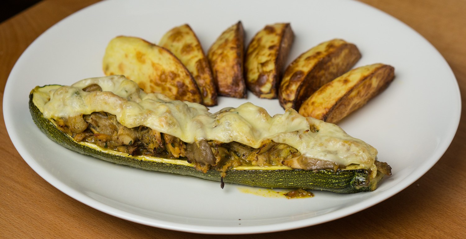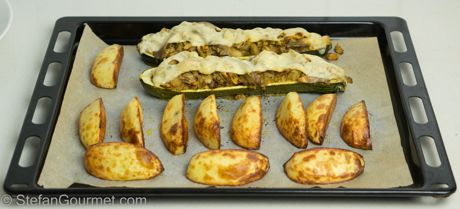 Serve the stuffed zucchini with the potato wedges.