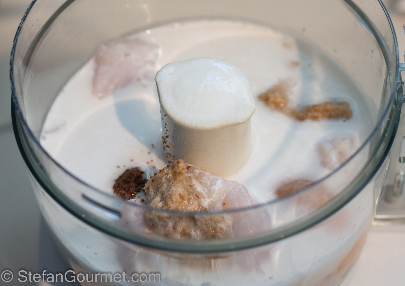 Combine 450 grams (1 lb) fillet of white fish, 3 Tbsp Kaeng Kua curry paste, 1 egg, 300 ml (1 1/4 cup) thin coconut milk, 2 Tbsp fish sauce and 1 tsp palm sugar in the bowl of a food processor.