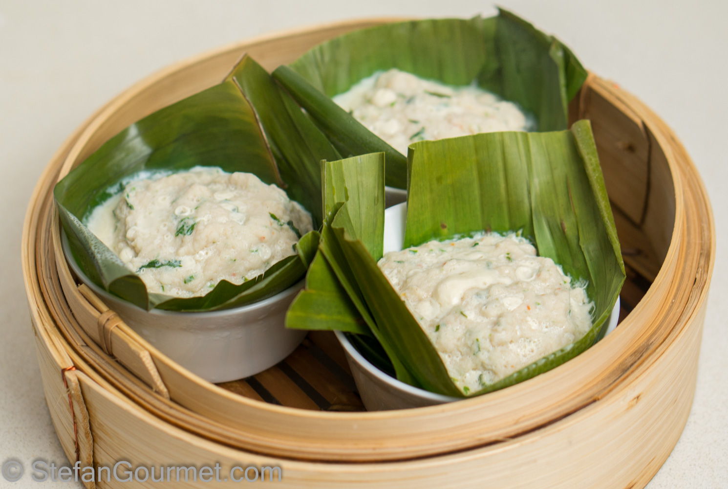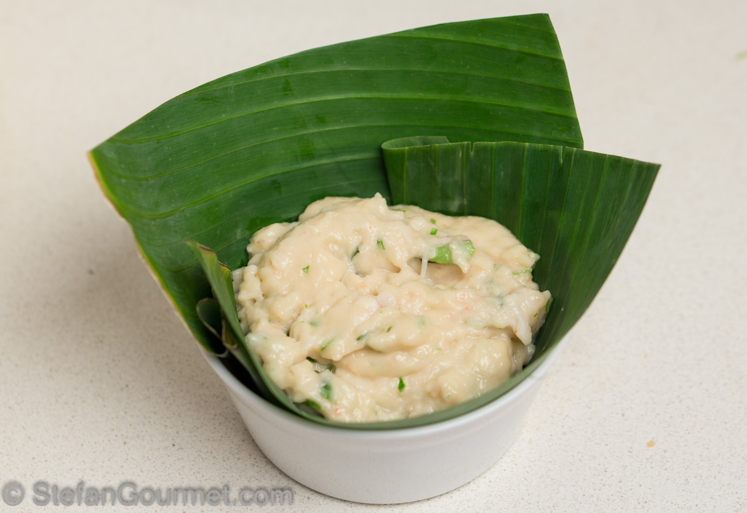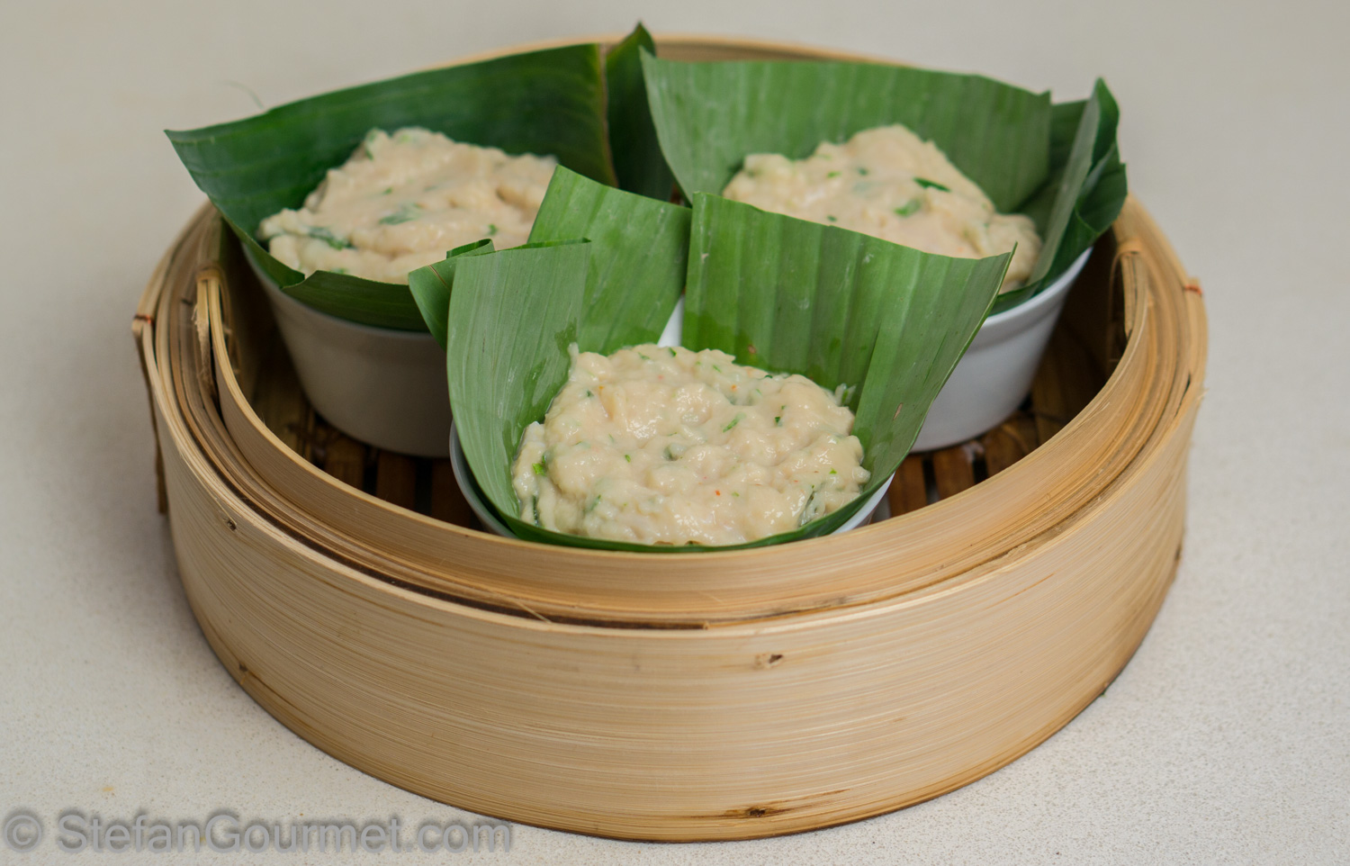 Use ramekins or other containers — I thought it was nice to line a ramekin with banana leaf. If you can find disposable banana leaf containers they might be best, as the liquid that will be released by the fish mousse when it is cooked will drain automatically that way.
