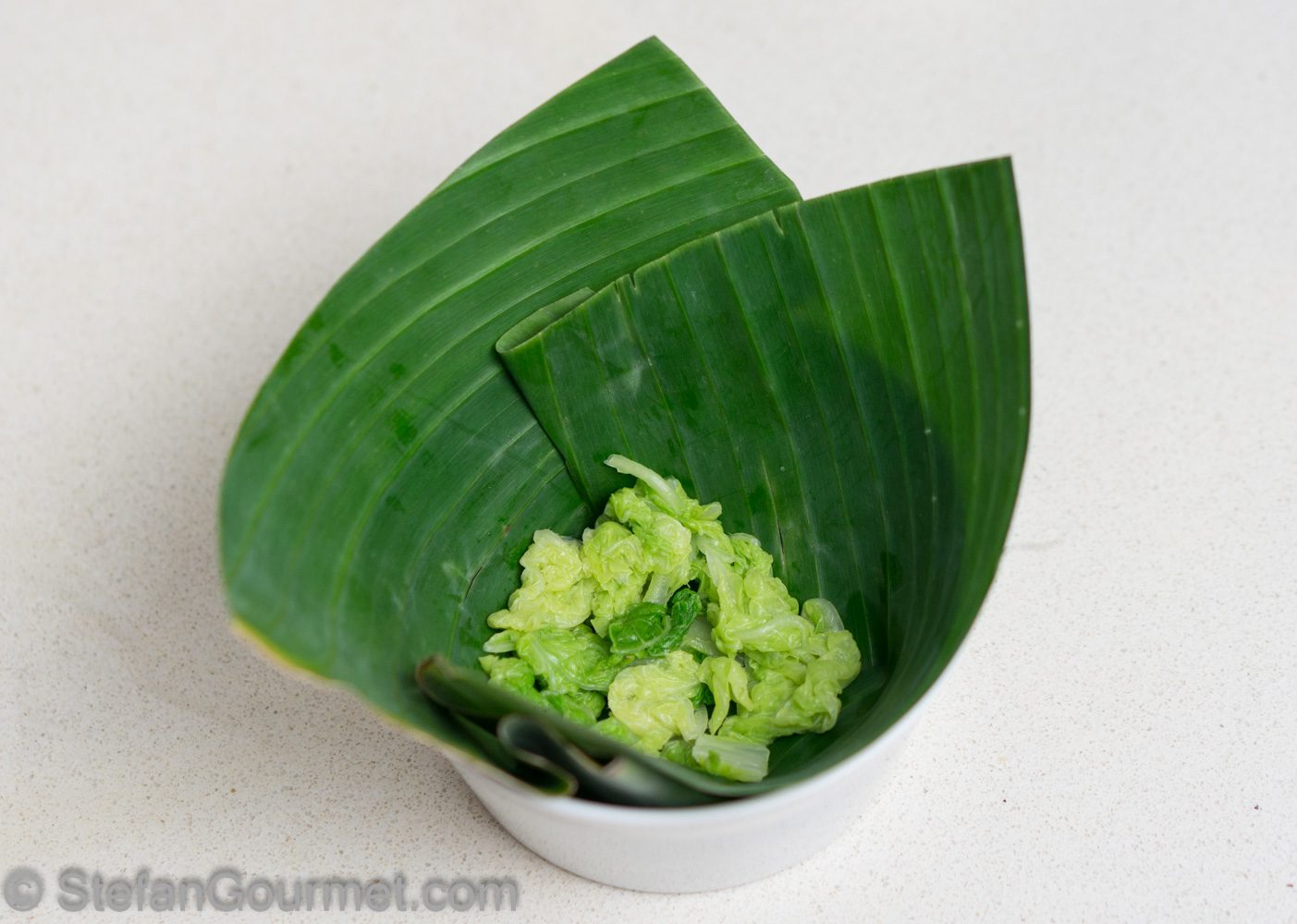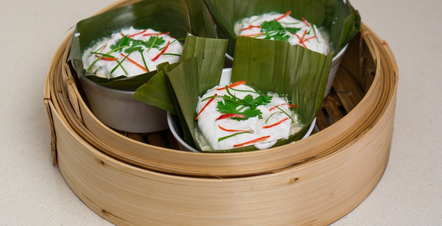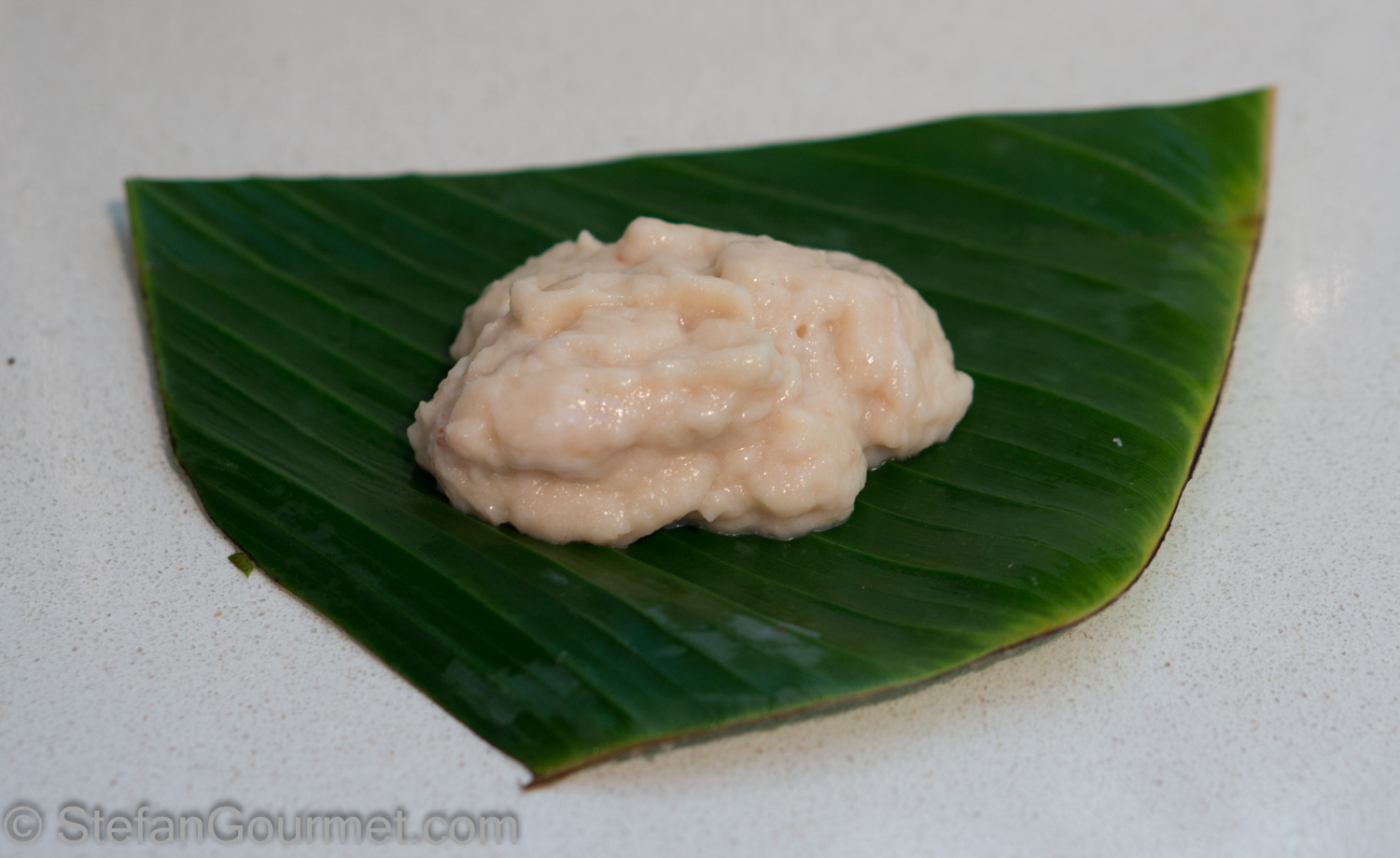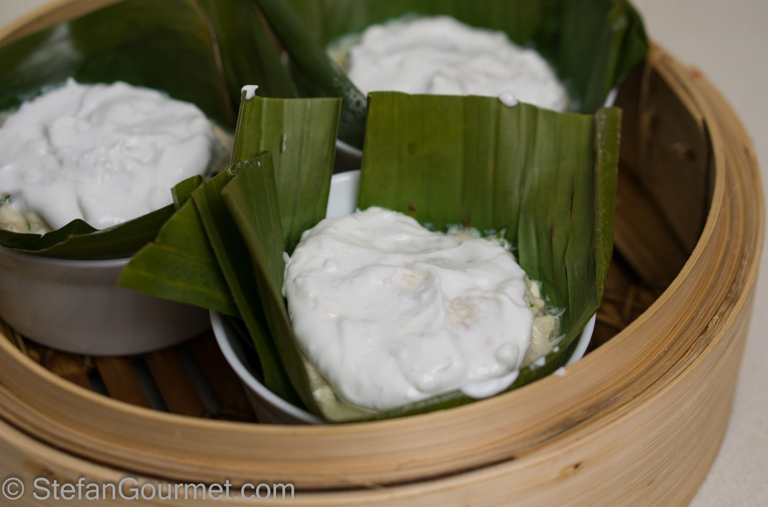 Use ramekins or other containers — I thought it was nice to line a ramekin with banana leaf. If you can find disposable banana leaf containers they might be best, as the liquid that will be released by the fish mousse when it is cooked will drain automatically that way.