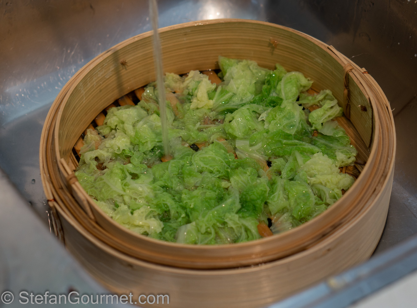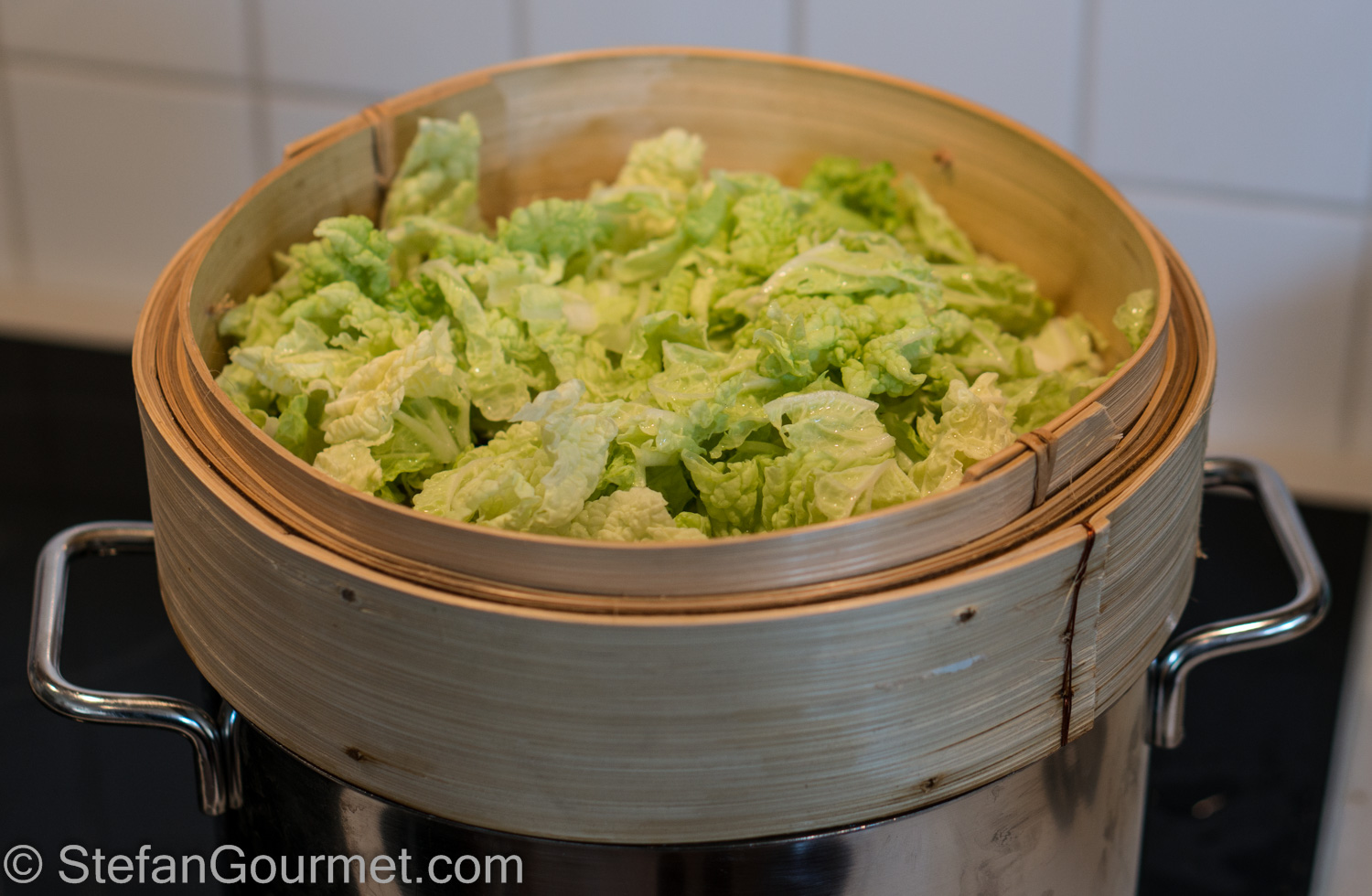 Put 400 grams (.9 lb) of shredded napa cabbage in a steamer, and steam for 5 minutes.