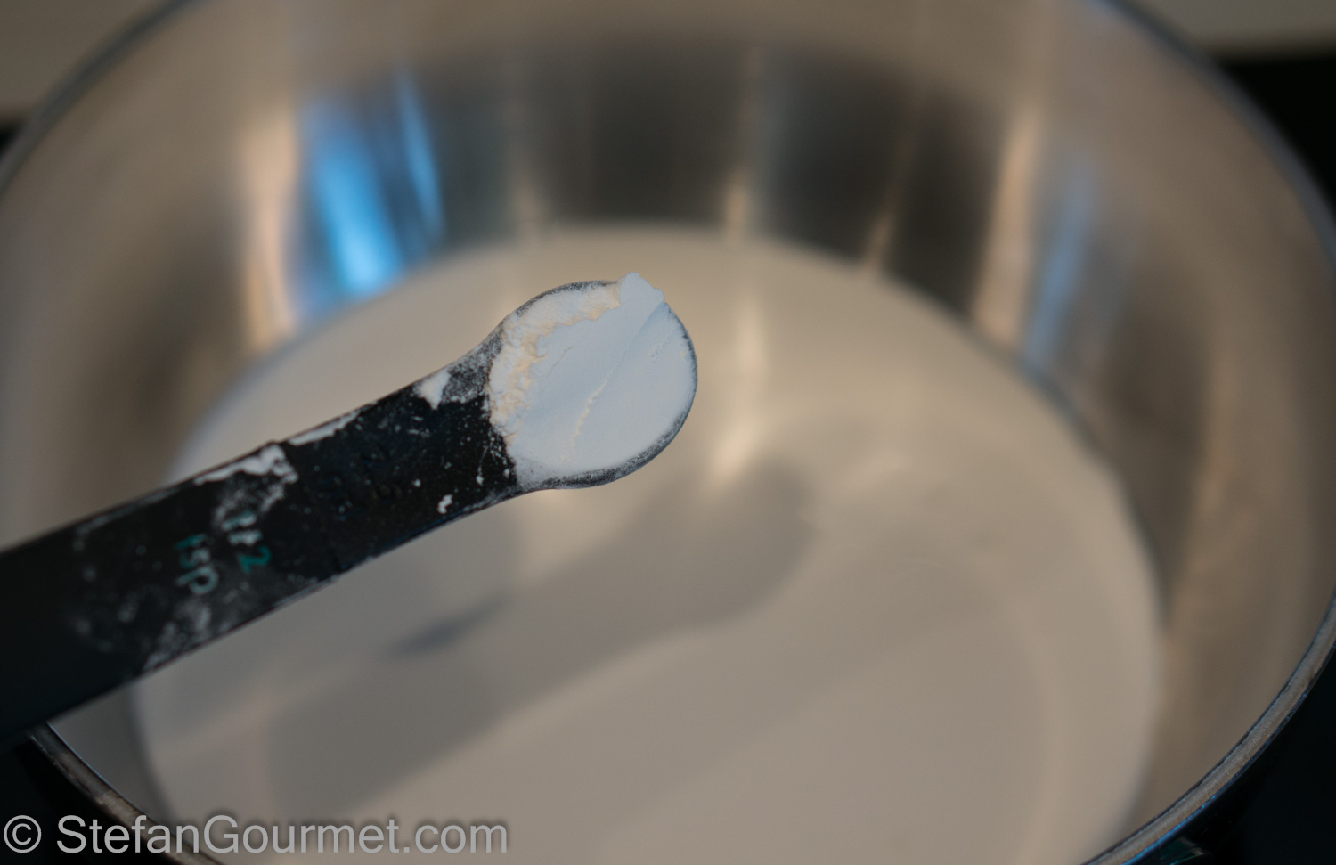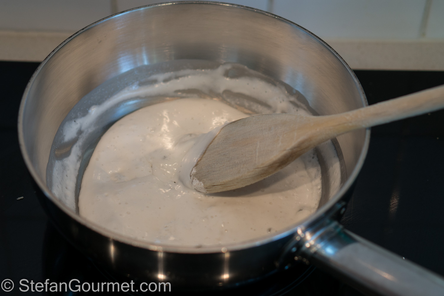 Meanwhile, put 150 ml (2/3 cup) of coconut cream in a saucepan and add a teaspoon of rice flour.