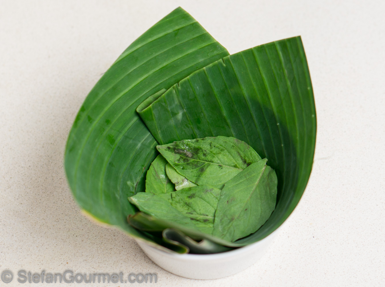 Pick the leaves from the remaining 20 grams (.8 oz) of Thai basil, and divide the leaves between the ramekins.