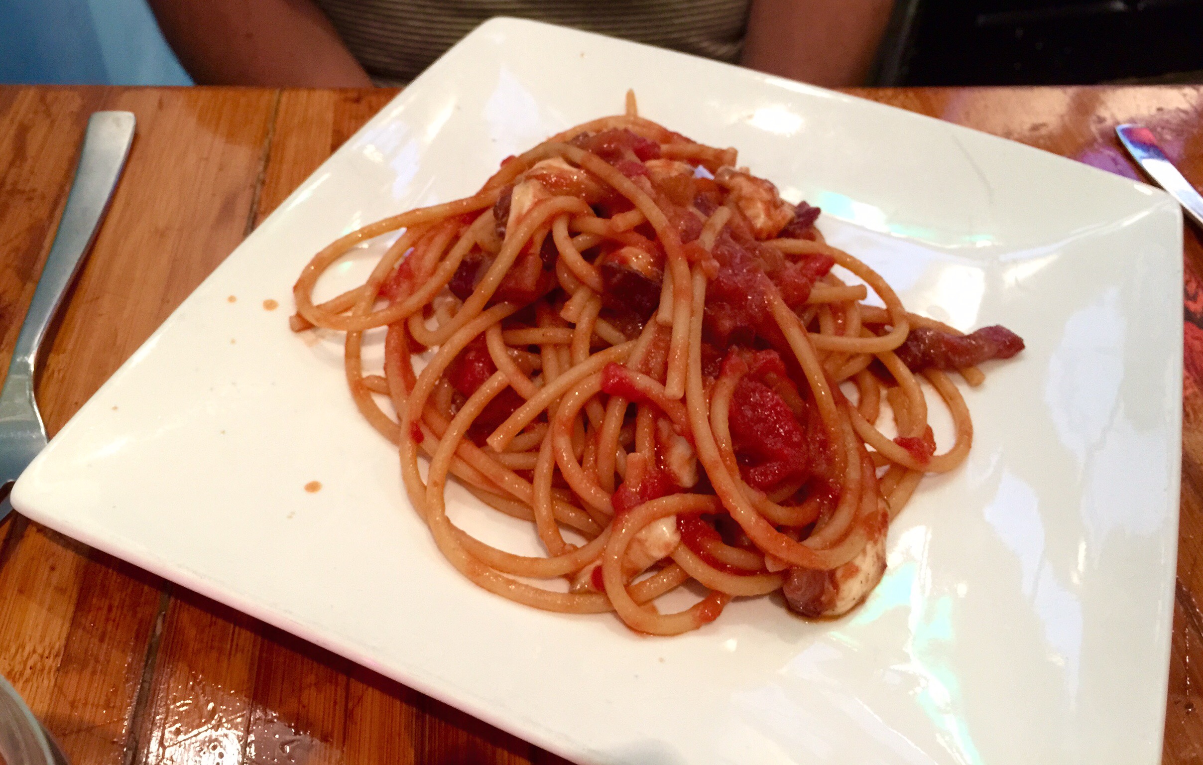 Kees had the daily special: bucatini with a fresh tomato sauce with smoked pancetta and scamorza (smoked mozzarella). He especially liked the deep flavor of the tomato sauce and just the right amount of smokiness (9/10).