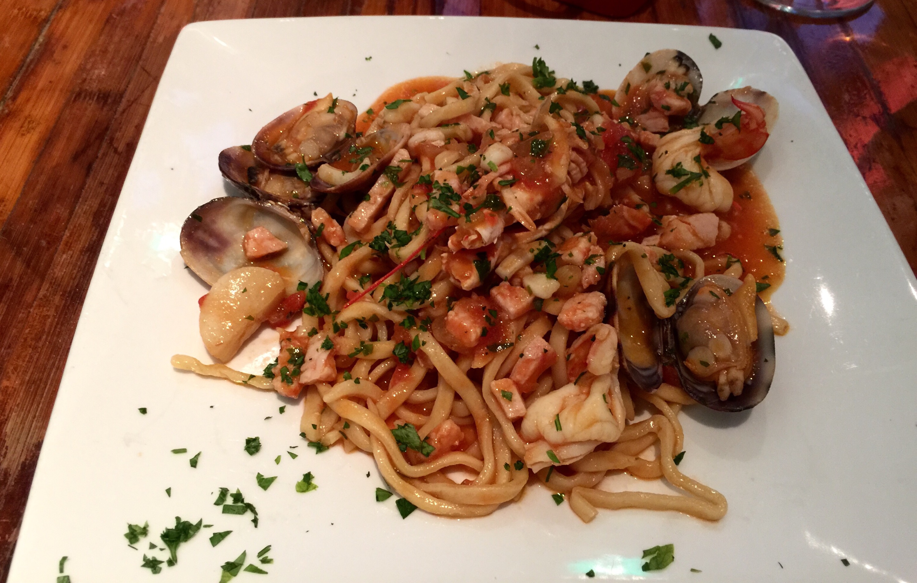 As primo piatto I had fresh tagliolini with a seafood sauce. The tagliolini were freshly made and perfectly al dente. The tomato sauce had great flavor with just the right balance between tomato, seafood juices, and a tiny bit of peperoncino. The seafood (clams, scallops, shrimp, and fish) was abundant and cooked just right (9/10).