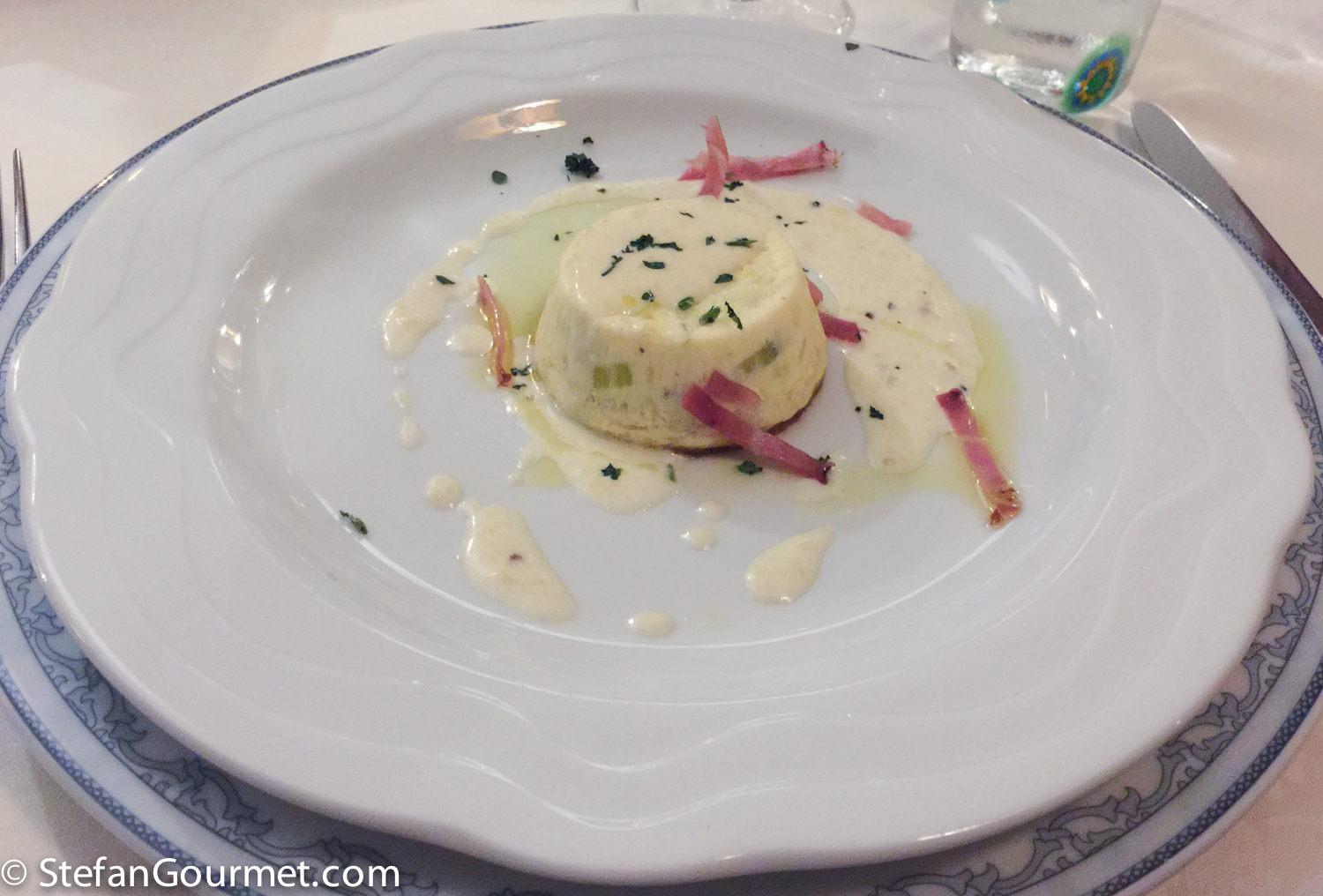 The first antipasto: sformatino (similar to a soufflé) with leeks and formaj dal cit (a special local cheese) with crispy prosciutto (culatello di Sauris). The sformatino had a perfect velvety consistency and the leek flavor was just right. 9/10
