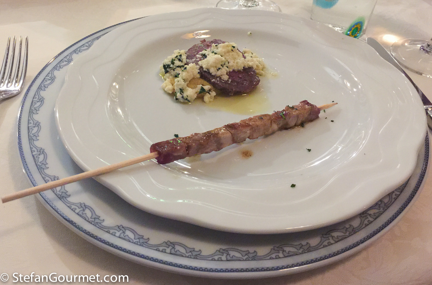 The second antipasto: pitina (a local salame) with polenta and sheep’s milk ricotta, and a skewer (arrosticino) with delicious tender pork neck. The salame, polenta, and ricotta worked very well together. 8/10