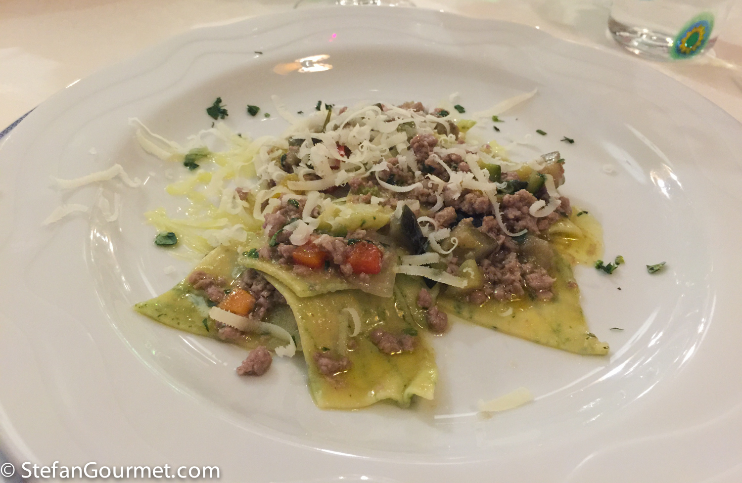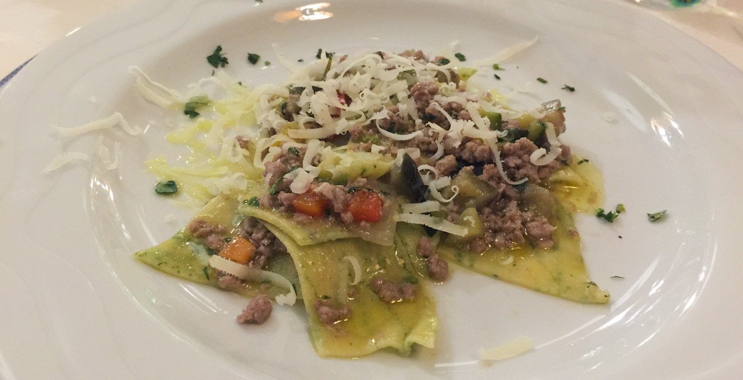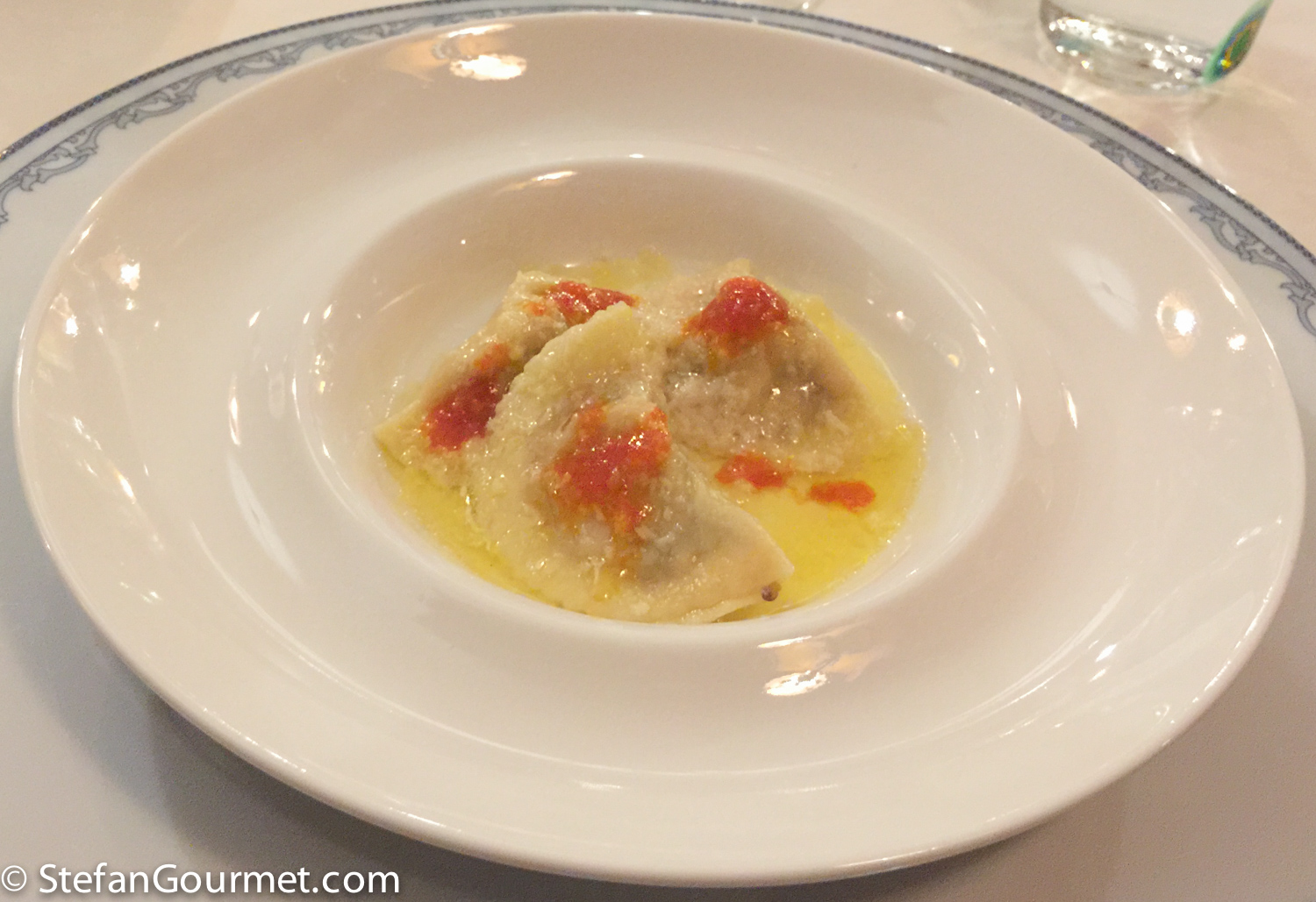 First primo: tortelli with eggplant and ricotta, served with butter di Malga and just a bit of tomato. 8/10